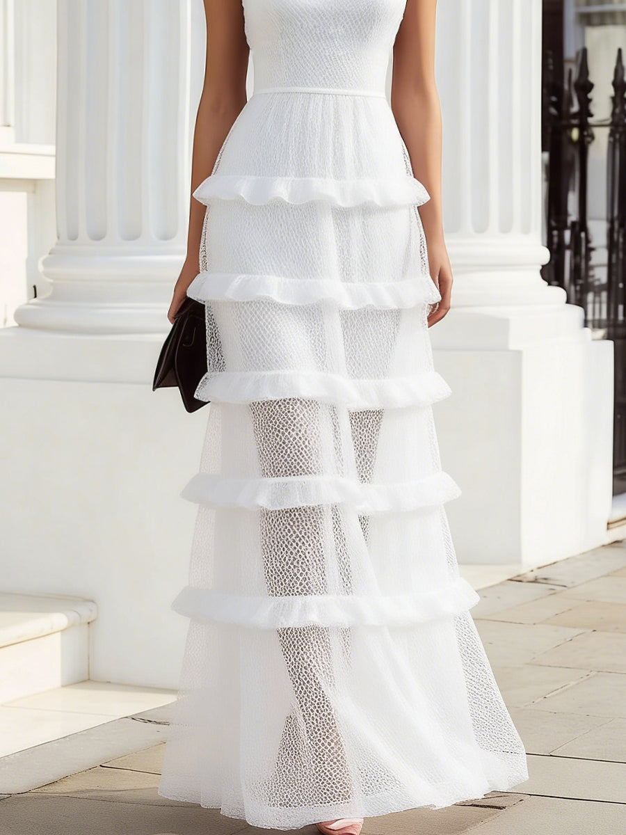 Sheer Mesh Tiered Ruffle Maxi Evening Dress