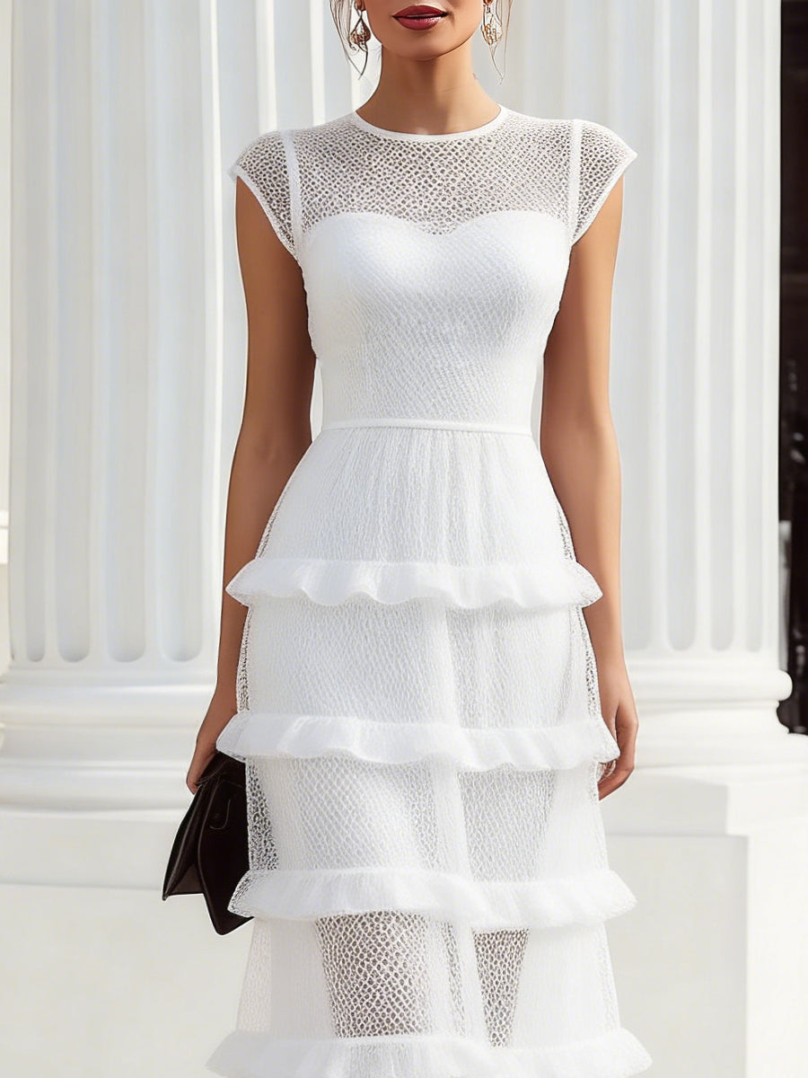 This ethereal white evening dress captures the perfect balance of elegance, femininity, and modern refinement. Crafted with delicate mesh from neckline to hem, the gown creates a dreamy, light-filled silhouette that moves beautifully with every step. The bodice features a soft sweetheart lining beneath a sheer mesh overlay, offering a graceful and subtly romantic contrast. Cap sleeves frame the shoulders with a polished, timeless appeal, while the defined waistline gently sculpts the figure for an elongated, balanced shape.