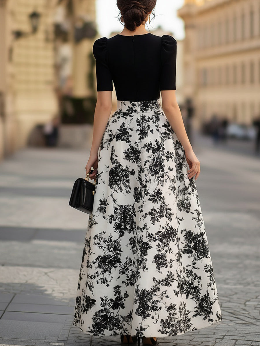 Crafted for the modern woman who embodies romantic sophistication with timeless elegance, this one-piece maxi dress is a refined choice for premium formal and social occasions. It features a sleek black bodice with a round neckline and structured puff sleeves, seamlessly transitioning into a high-waisted, flowy maxi skirt adorned with a delicate black floral print on an ivory base. The contrast between the solid bodice and romantic skirt exudes understated luxury, making it a standout staple for your event wardrobe.