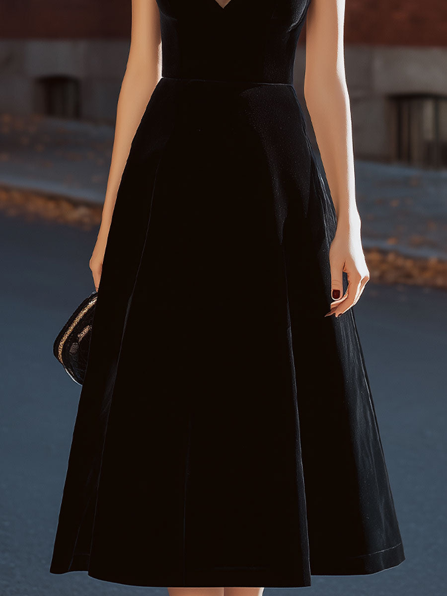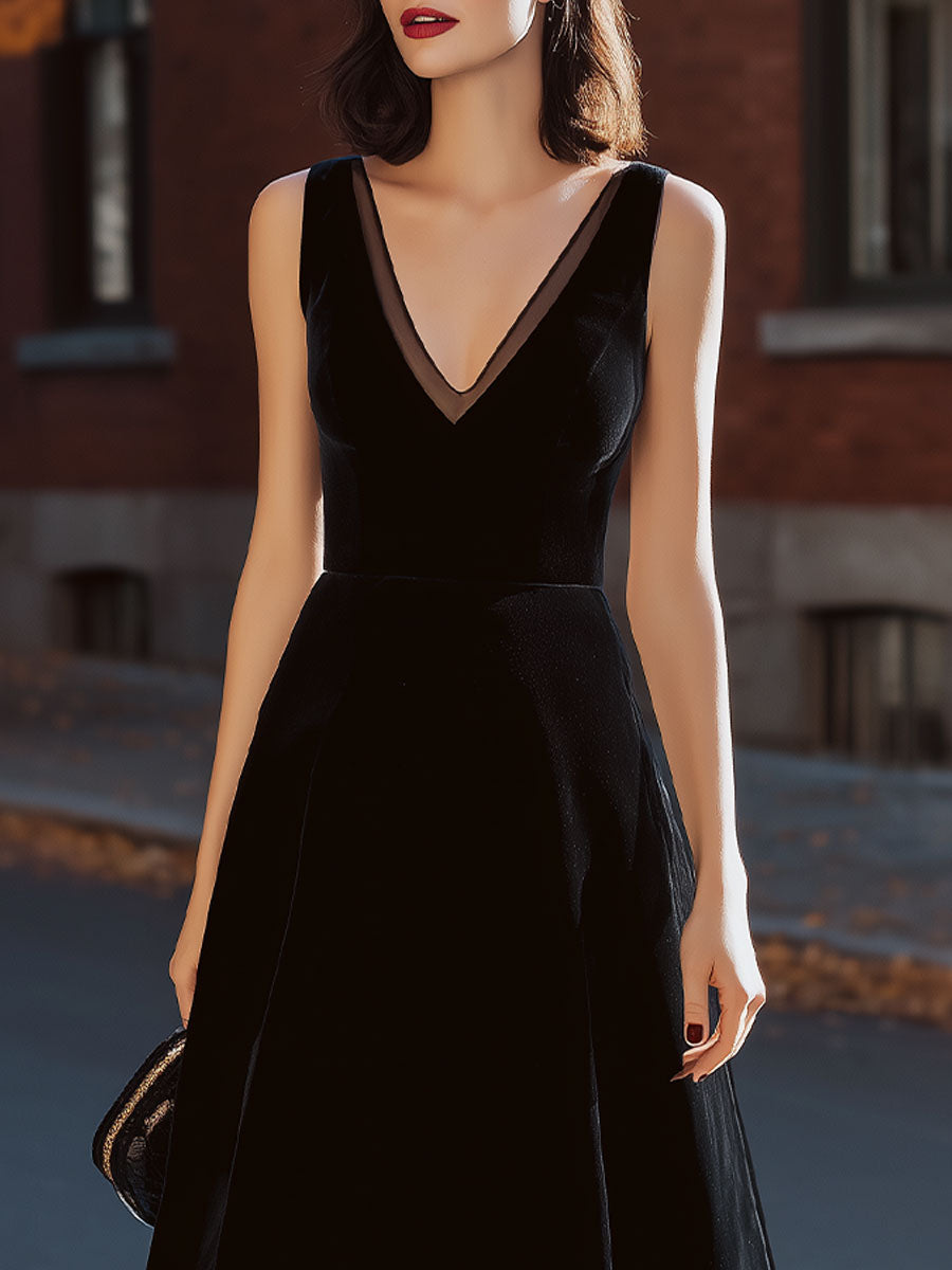 Crafted for the woman who loves subtle drama and plush elegance, this black velvet midi dress blends rich texture with delicate detailing for a timelessly chic look. The sleeveless silhouette features a deep V-neckline trimmed with sheer mesh , while the fitted bodice transitions into a flowing fit-and-flare skirt that balances structure with graceful movement. The luxe black velvet fabric catches light with a soft sheen, elevating the classic silhouette into a standout piece.