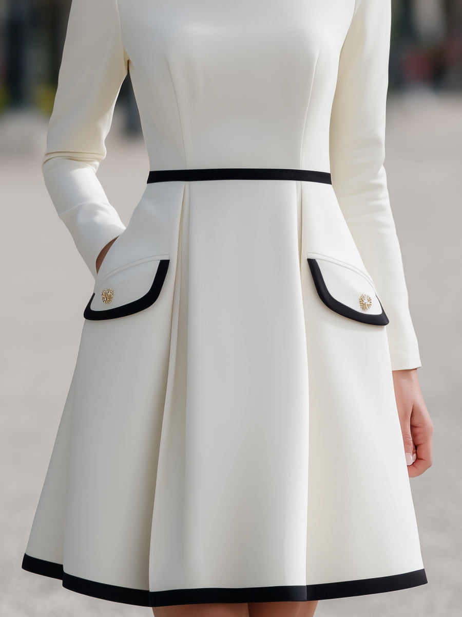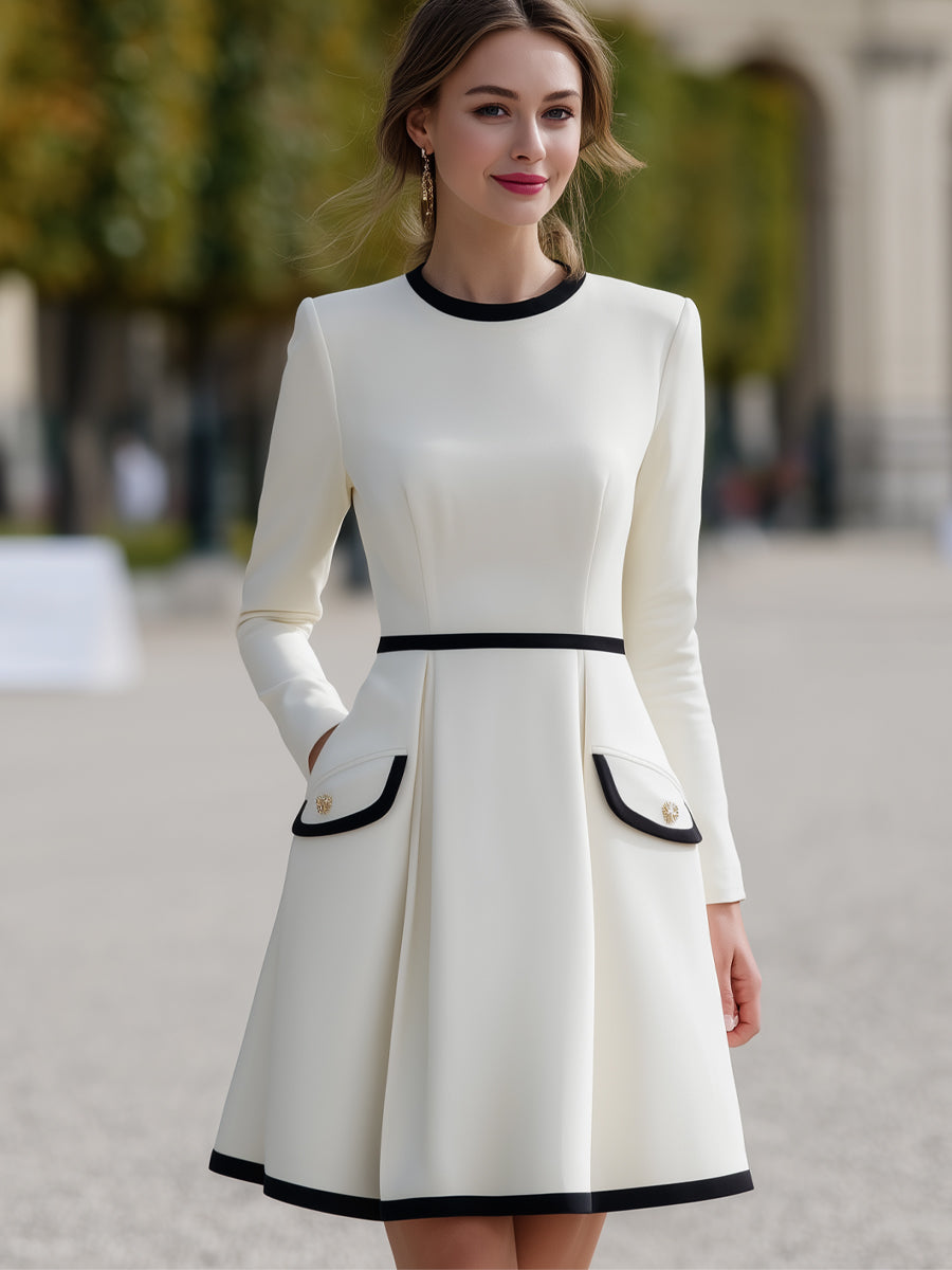 Mooyius presents a refined A-line dress that blends clean modern lines with timeless elegance. Designed with a minimalist silhouette, this piece highlights precision tailoring and thoughtful detailing. The smooth structured fabric creates a polished drape, enhanced by crisp contrast trims that frame the neckline, waist, pocket flaps, and hemline.
