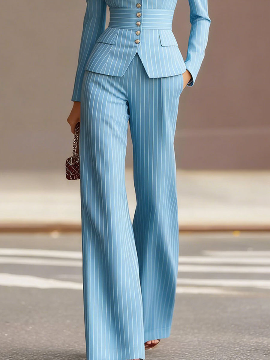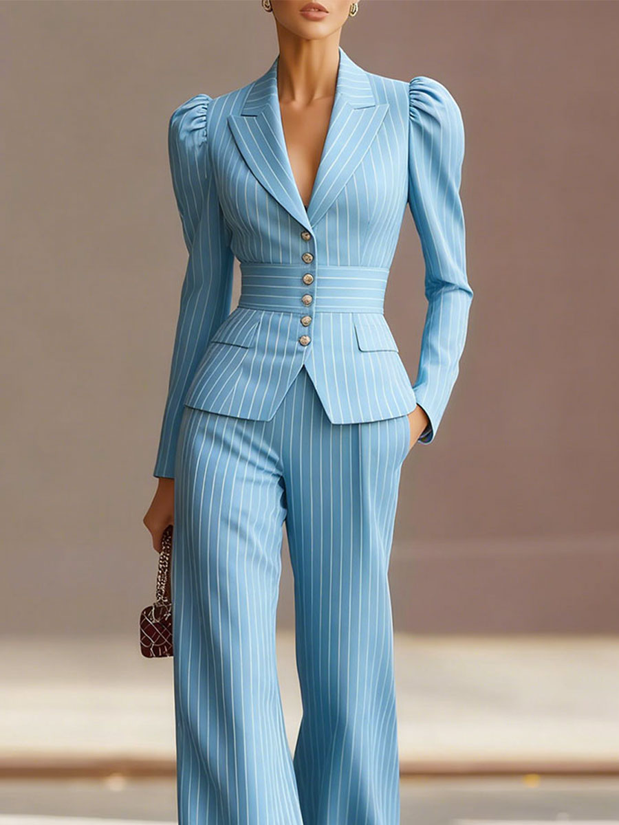 Mooyius Presents The Chic Sky Blue Pinstripe Tailored Suit Set