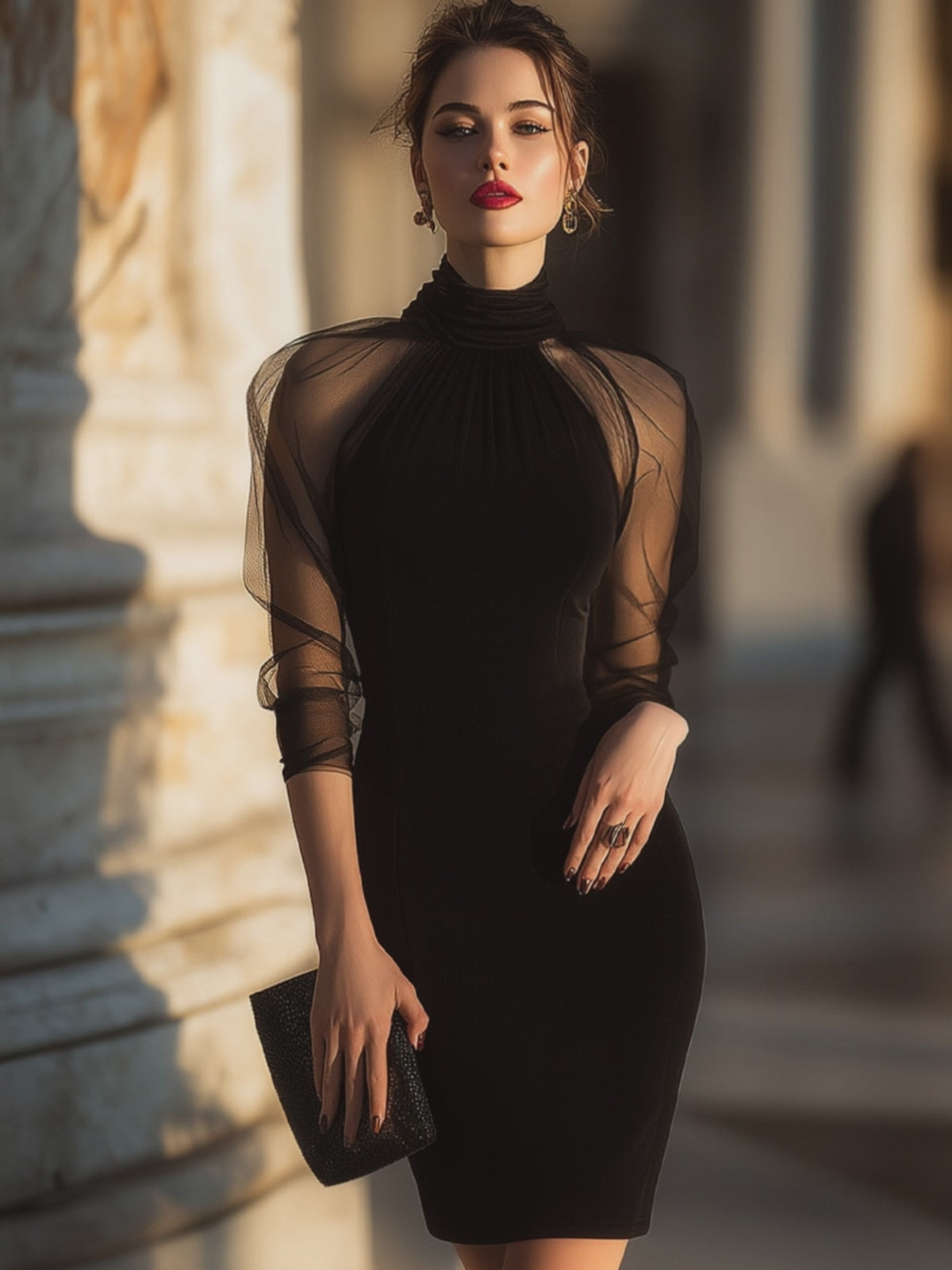 Designed to balance sophistication and allure, this cocktail dress achieves a memorable evening presence through its interplay of clean tailoring and ethereal transparency—perfect for the woman who values elegance with modern distinction.