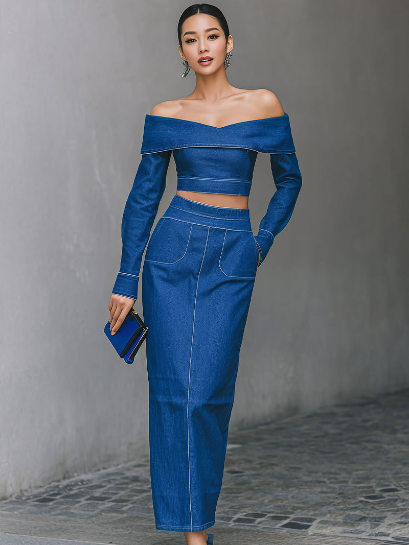 Off-the-Shoulder Denim Crop Top & Midi Skirt Set
