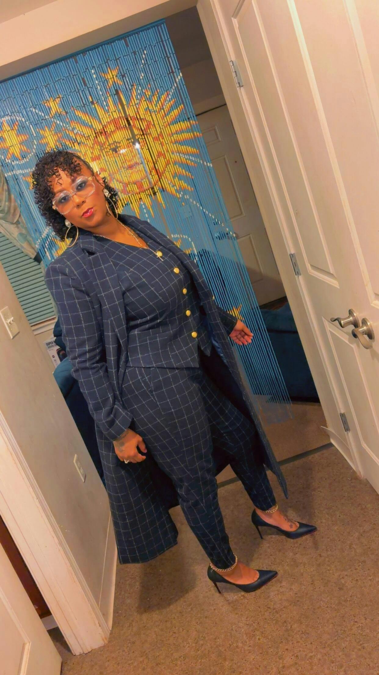 Mooyius introduces a refined interpretation of British-inspired tailoring with this navy checkered three-piece suit. The set features a long tailored overcoat, a fitted waistcoat with gold-tone buttons, and slim-cut trousers, all crafted in a structured check pattern that exudes timeless sophistication. The sharp blazer-style coat adds authority and movement, while the waistcoat brings definition to the silhouette.