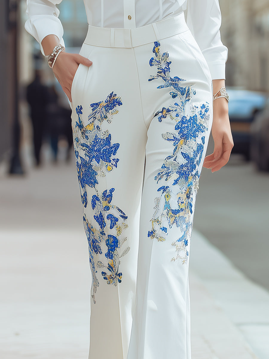 - Design: The trousers feature elegant blue floral embroidery inspired by delicate botanical patterns, placed along the upper leg for a refined artistic effect