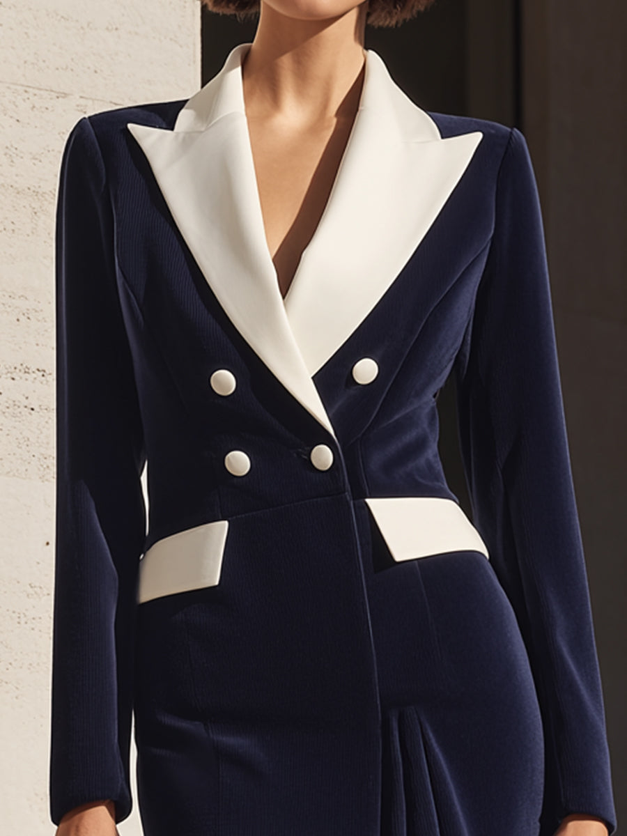Navy Contrast-Lapel Tailored Double-Breasted Blazer Dress