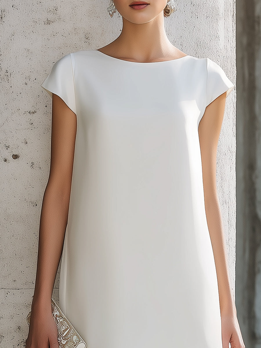 Mooyius presents a modern shift dress designed to express refined simplicity through clean lines and subtle layered detailing. This elegant silhouette features a soft boat neckline that gently frames the collarbones and shoulders, creating a graceful and understated upper profile. The relaxed bodice is designed with smooth, minimal tailoring that allows the garment to drape naturally over the body, delivering effortless sophistication while maintaining a polished aesthetic. Cap sleeves extend softly over the shoulders, adding delicate structure and balanced coverage that enhances the refined silhouette. The dress follows a relaxed shift shape that offers comfort while preserving a sleek, contemporary appearance. The minimalist upper structure transitions into a layered hemline that introduces a subtle yet distinctive design element. A sheer underlayer emerges beneath the outer hem, creating a softly translucent panel that adds depth and visual dimension to the overall design. This layered effect enhances the movement of the dress while maintaining a light and elegant feel. The slightly extended back hem further contributes to the fluid silhouette, giving the piece a graceful and modern finish that moves beautifully with each step.