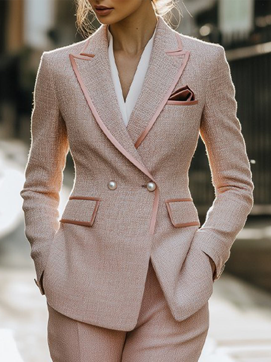 Chic Soft Pink Tweed Suit with Feminine Tailoring and Pearl Accents