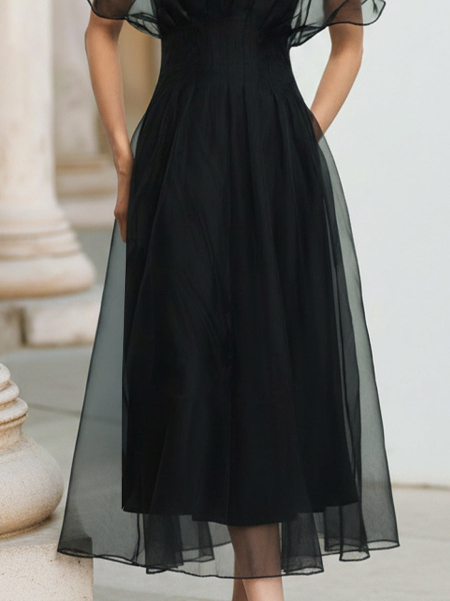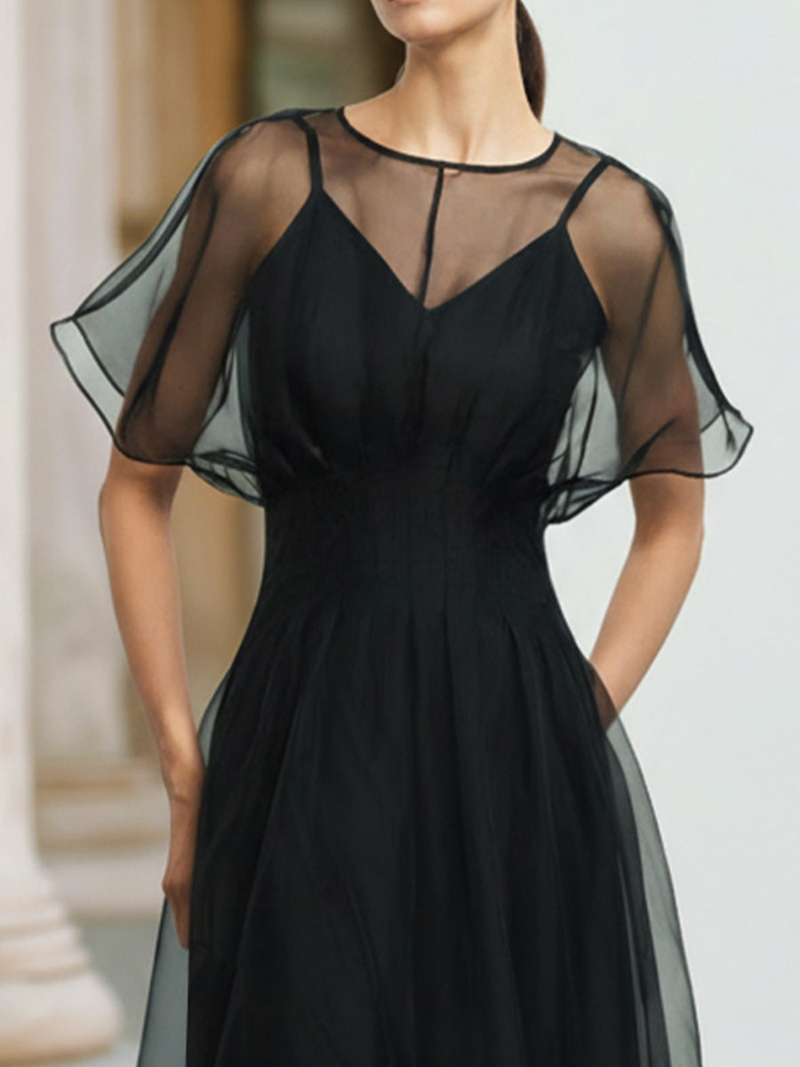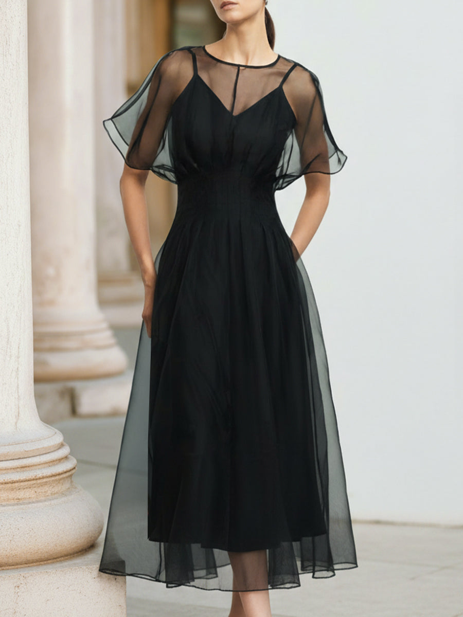 Elegant, fluid, and quietly striking, this black sheer midi dress is designed to embody modern femininity with a refined, airy touch. The dress features a softly layered silhouette that moves gracefully with every step, creating an effortlessly sophisticated presence. A semi-sheer chiffon overlay adds depth and dimension, allowing subtle transparency at the sleeves and hem while maintaining a polished, confident look.