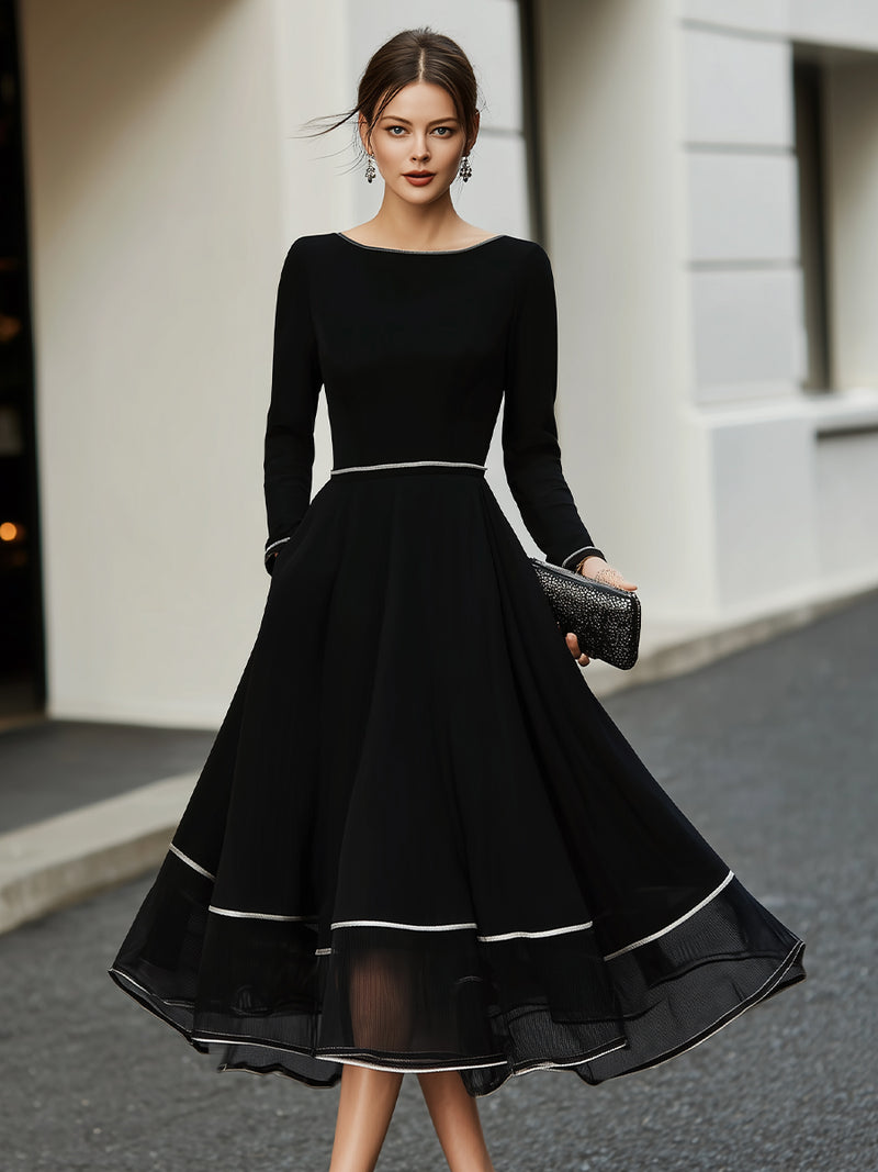 Long Sleeve Contrast Trim Midi Dress With Flared Skirt