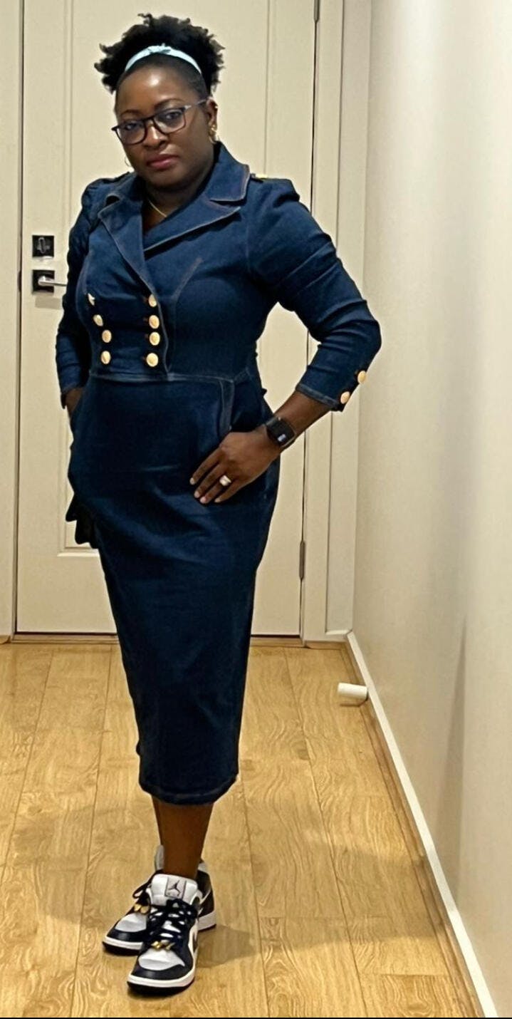 The Double-Breasted Structured Denim Midi Dress is a refined reinterpretation of denim, seamlessly blending utilitarian influence with timeless sophistication. Crafted with precise tailoring, this piece highlights the waist with a fitted silhouette while maintaining a confident, structured form. The wide lapel collar and sharp shoulders add a powerful edge, softened by the feminine lines of the midi-length skirt. A striking double-breasted front adorned with gold-toned embossed buttons not only elevates the design but also enhances its military-inspired aesthetic.