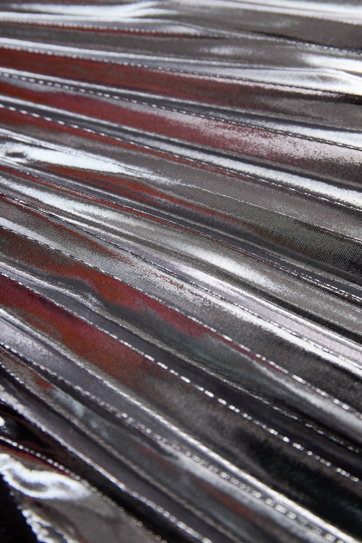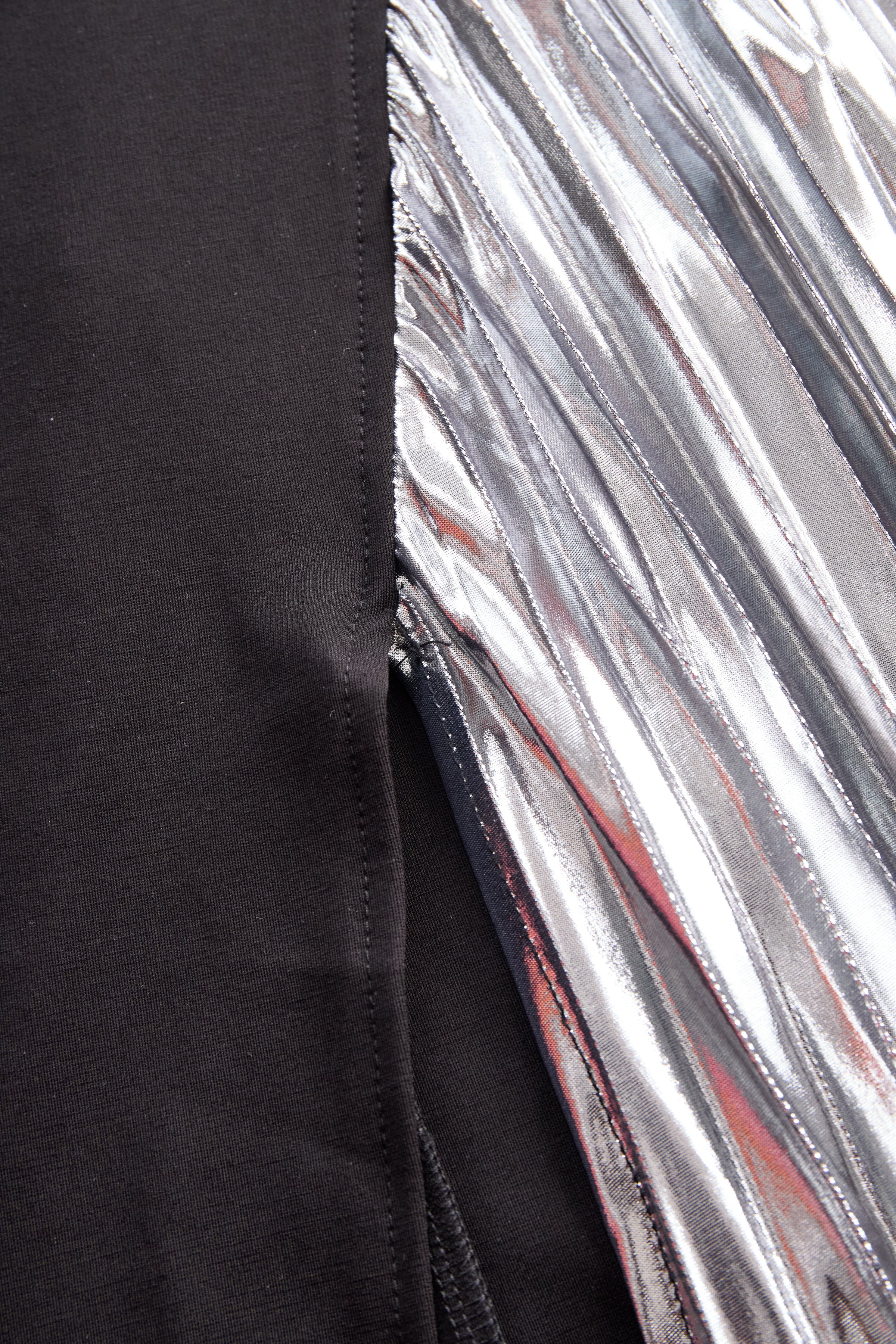 Elevate your evening style with this captivating one-shoulder gown featuring shimmering metallic pleated inserts. The sleek black silhouette is contrasted with radiant silver pleats at the bodice and skirt slit, creating a bold and sophisticated statement.