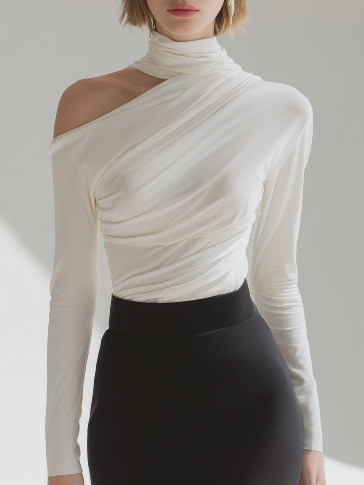 Asymmetric Draped High-Neck Long Sleeve Top