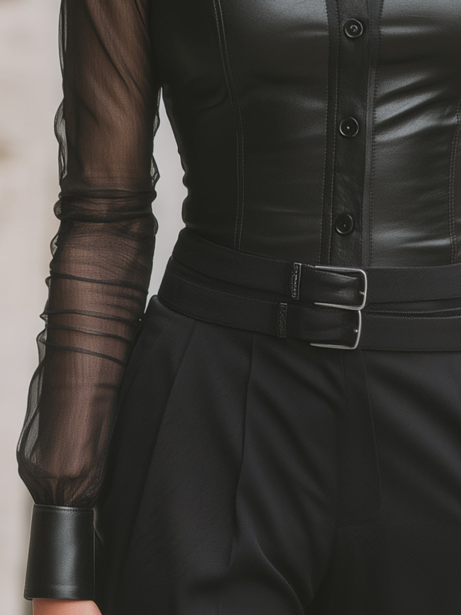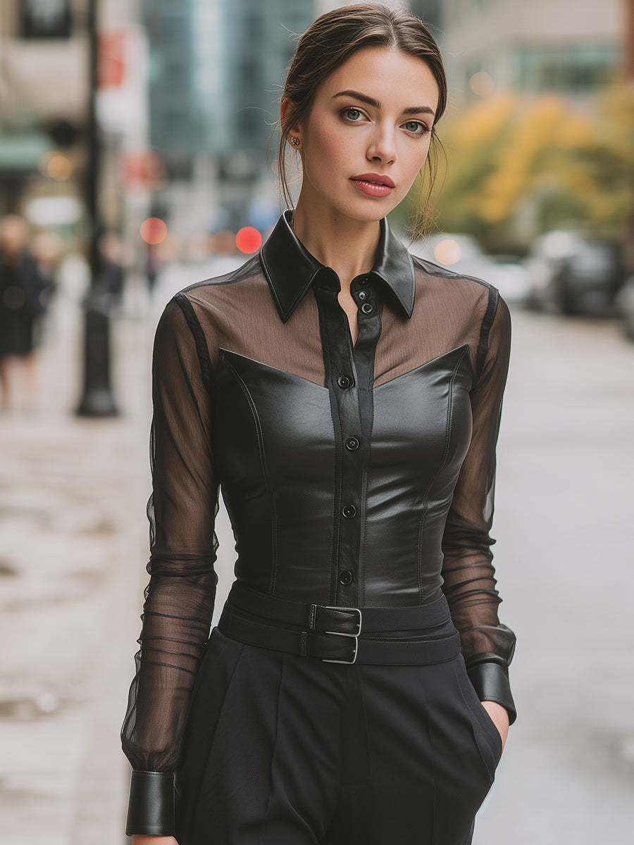 This Black Faux Leather Sheer Mesh Panel Shirt is a bold yet elegant expression of contemporary tailoring, designed to highlight contrast, structure, and femininity. Combining sleek faux leather with delicate sheer mesh, this piece delivers visual intrigue while maintaining a refined, wearable silhouette.