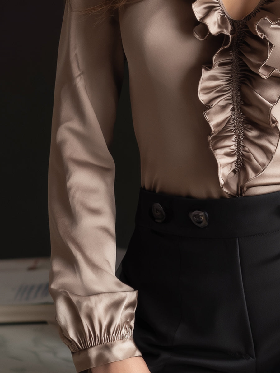 Ruffled V-Neck Satin Blouse With Long Sleeves