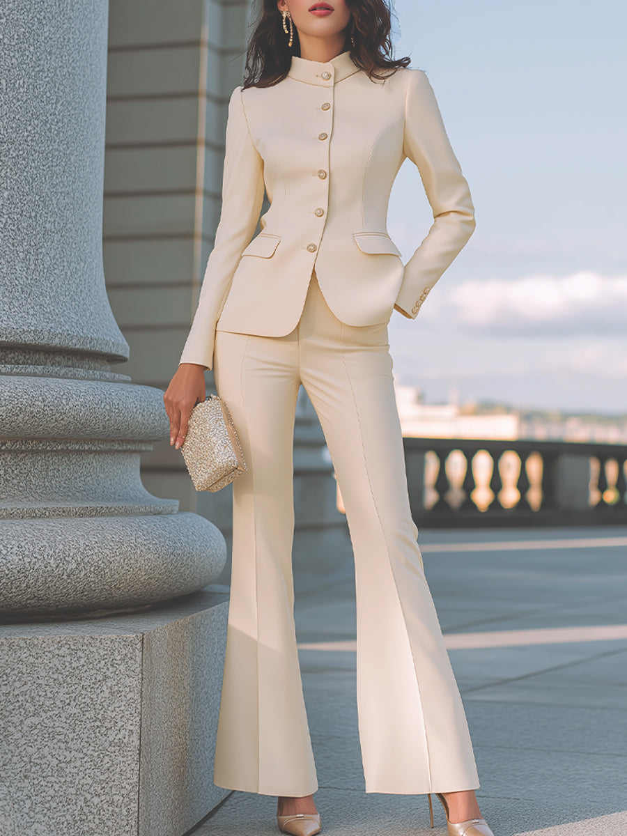 Mooyius presents a refined two-piece suit designed to embody timeless elegance and sculpted femininity. This impeccably tailored set features a structured blazer with a clean stand collar and a sleek button-front closure that creates a streamlined, elongated silhouette. Precision seam detailing contours the waist, while flap pockets add subtle dimension and functional polish. The matching high-waisted trousers are tailored through the hips and thighs before flowing into a graceful flared hem, enhancing leg length and balancing the structured upper design. Every detail reflects thoughtful tailoring, offering a confident yet elegant presence that transitions effortlessly between formal and elevated everyday styling.