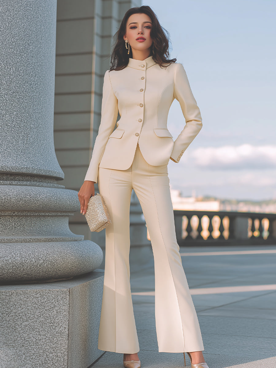 - Design: Two-piece suit set featuring a stand-collar blazer with button closure, sculpted seams, flap pockets, and coordinating high-waisted flared trousers