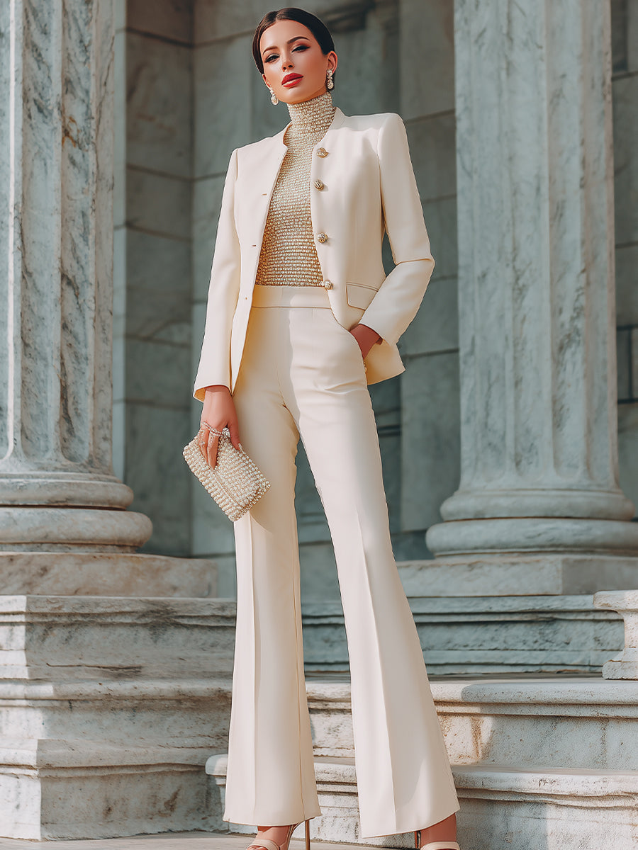 Mooyius presents a sophisticated two-piece suit set that embodies modern elegance and refined power dressing. This polished ensemble features a structured blazer paired with sleek tailored trousers, creating a confident silhouette designed for contemporary women who value both style and precision. The blazer is defined by a clean collarless neckline and a sculpted fit, enhanced with decorative button accents that add a subtle touch of luxury without overwhelming the minimalist design. Thoughtfully shaped seams create a flattering waistline while maintaining a sharp, professional profile. The matching trousers are tailored through the hip and thigh before falling into a gently flared leg, elongating the figure and adding graceful movement with every step. A smooth waistband ensures a clean finish and comfortable wear throughout the day.