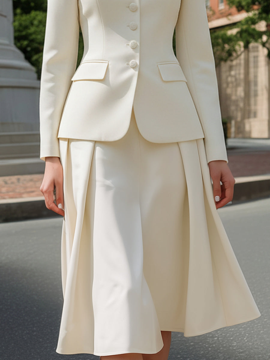This refined two-piece set is designed to convey timeless elegance through precise tailoring and graceful movement. The structured blazer features a clean V-neckline that creates a sleek, elongated upper silhouette while maintaining a polished, professional presence.The matching midi skirt introduces fluidity to the ensemble with its softly flared silhouette. Designed to sit naturally at the waist, the skirt falls into gentle pleats that move effortlessly with each step, creating a sense of lightness and refinement.