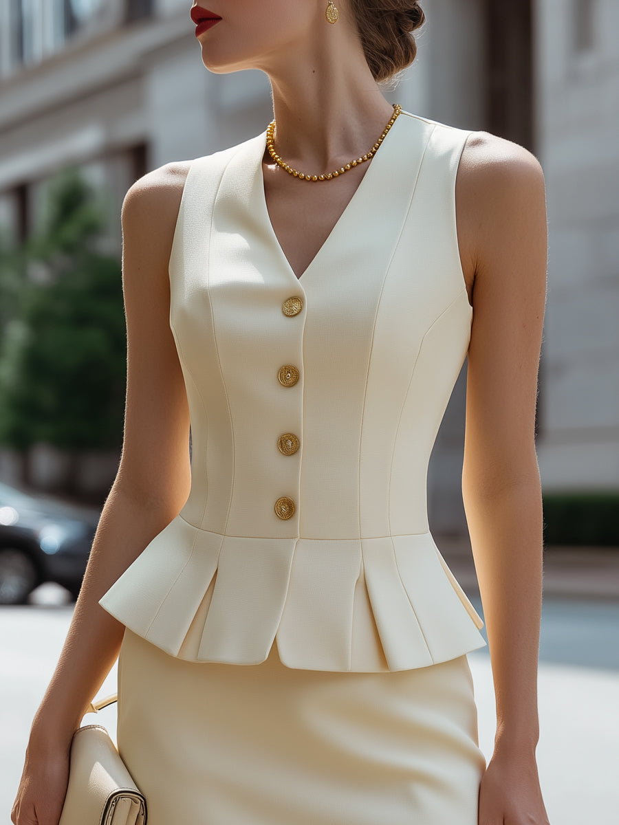 - Design: Two-piece set featuring a sleeveless V-neck tailored vest top with button-front detailing and subtle peplum shaping, paired with a high-waist pencil skirt