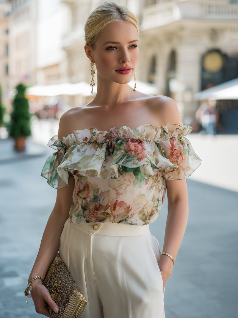 Off-Shoulder Ruffle Floral Chiffon Blouse