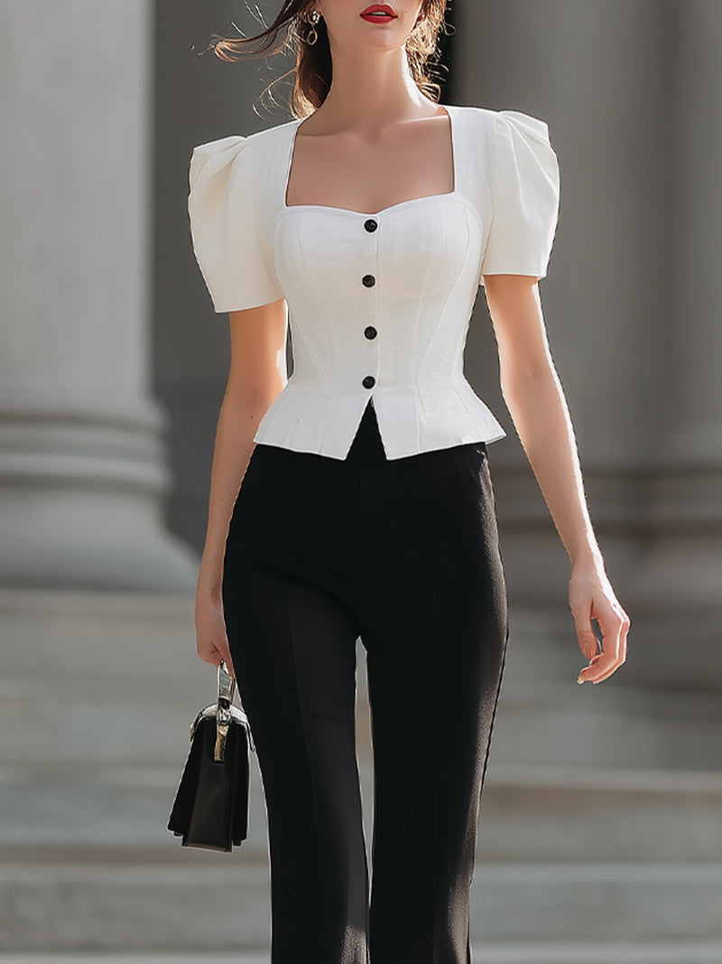 White Puff Sleeve Corset Crop Top & Black Flared Pants