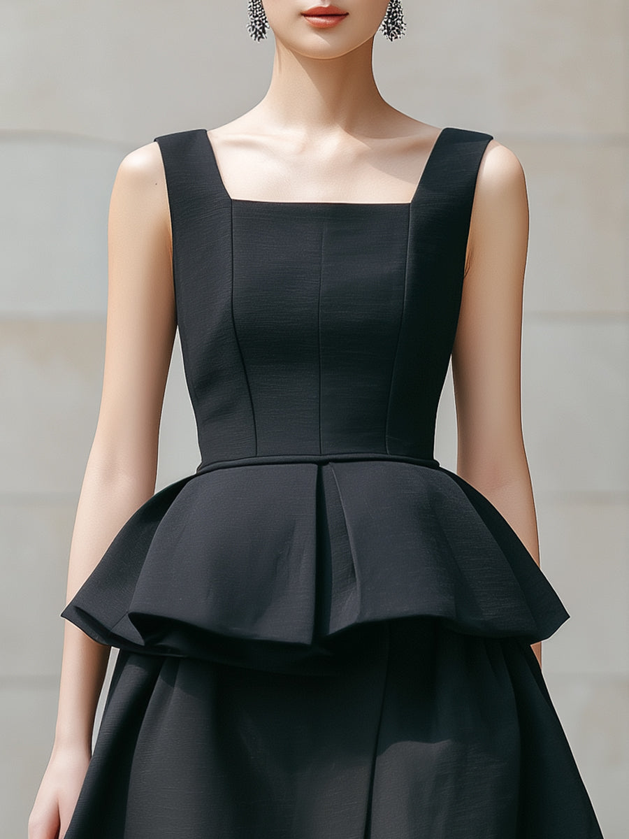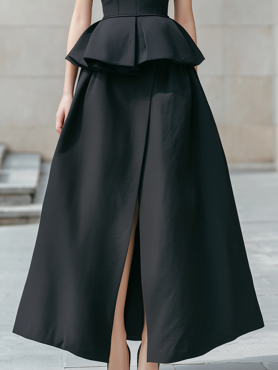 - Design:Square neckline, wide straps, fitted bodice, architectural peplum waist, full-length skirt, front slit, clean tailored construction