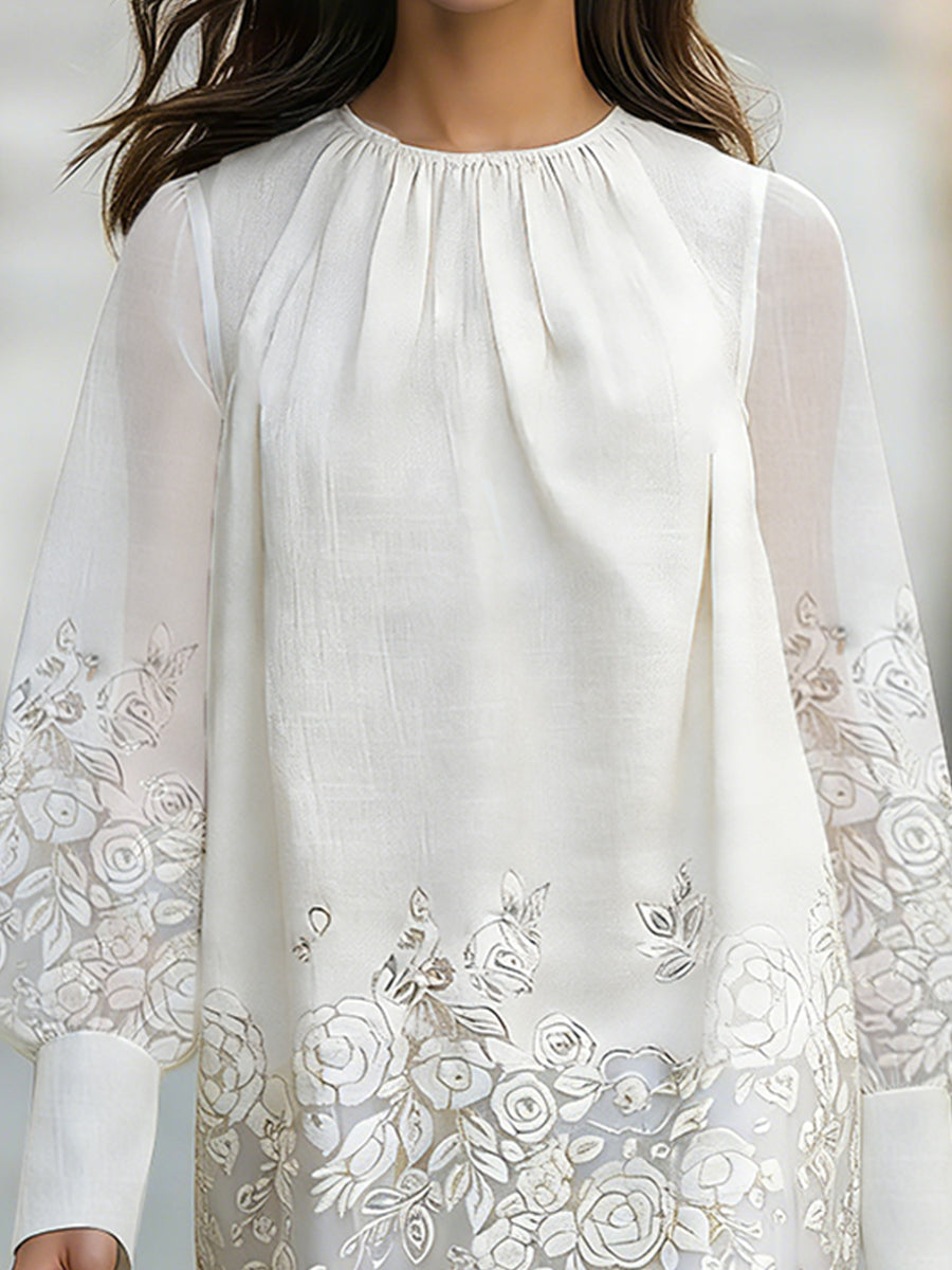 This white shift dress captures a refined balance between softness and sophistication, designed for women who appreciate subtle elegance with couture-inspired detailing. Crafted in a lightweight fabric base, the dress features a softly gathered round neckline that drapes naturally across the bodice, creating an effortless, fluid silhouette that flatters without clinging.