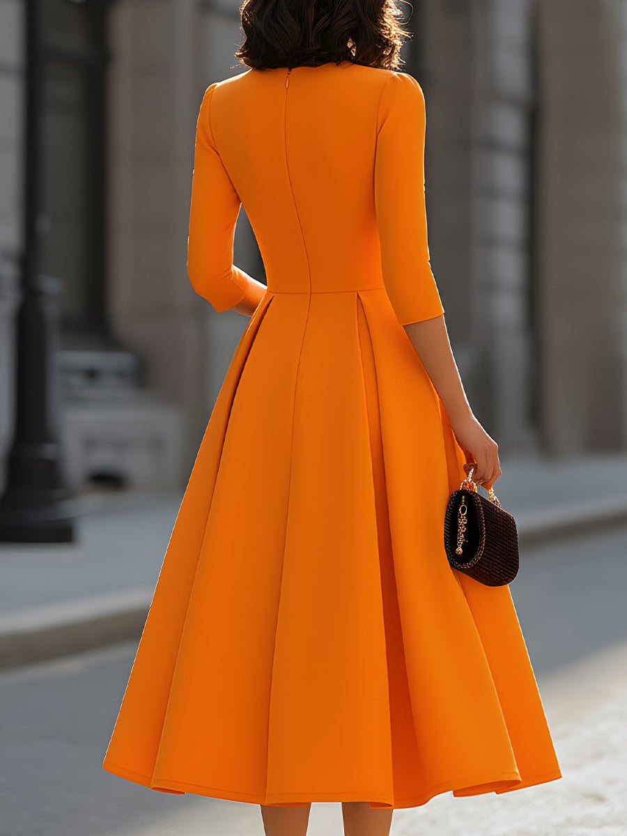Crafted for the modern woman who embraces bold confidence and timeless allure, this dress redefines contemporary style with a striking, figure-flattering silhouette. It features a deep V-neckline, elbow-length fitted sleeves, a tailored waist that cinches the figure, and a voluminous midi-length A-line skirt with structured pleats, all in a vibrant orange hue that exudes enduring confidence.