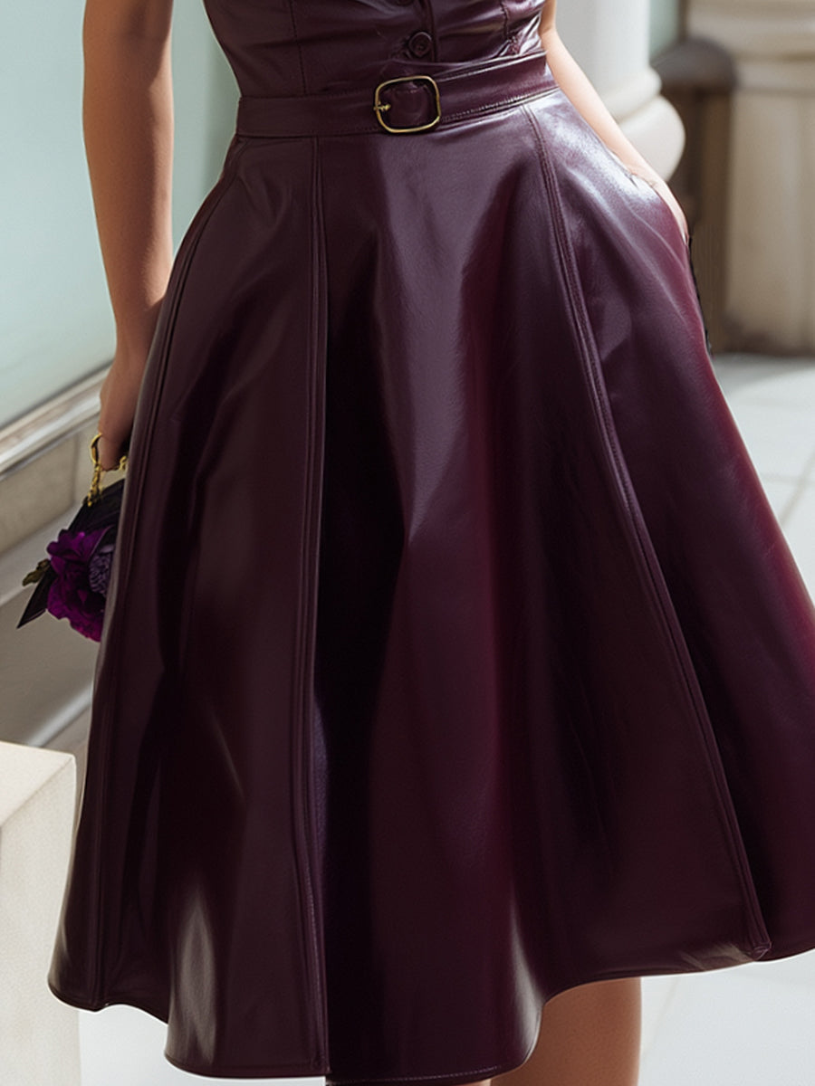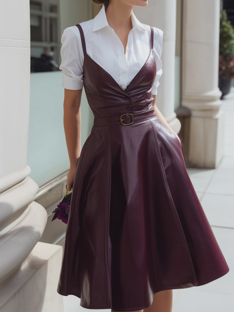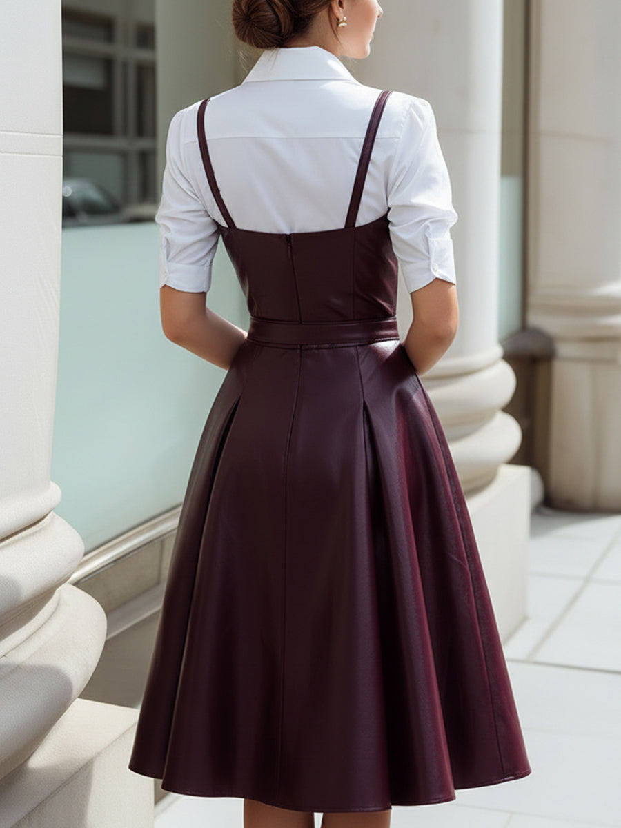 White Button-Up Shirt Dress With Wine-Red Leather Suspender Overlay