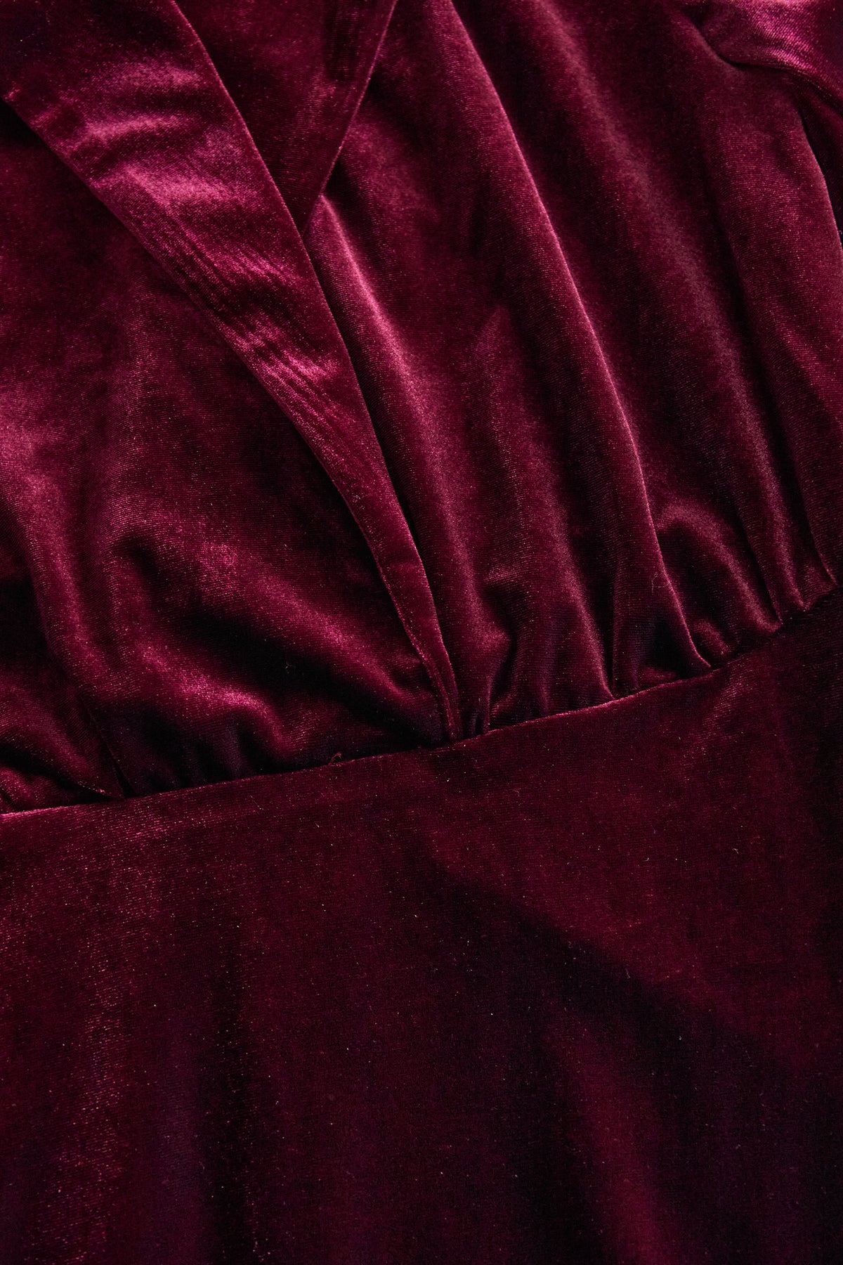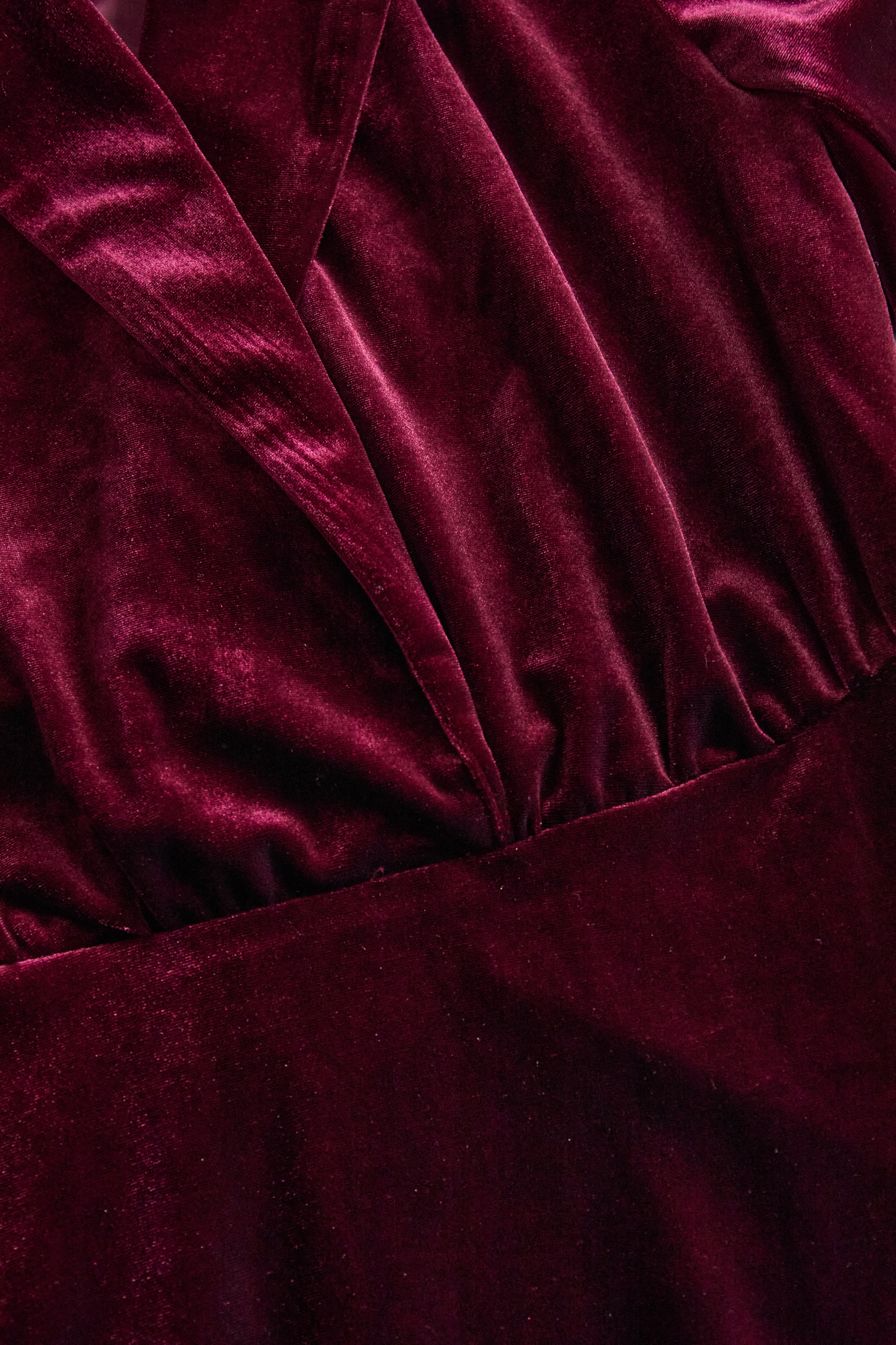 Elevate your evening style with this velvet dress, offering tailored details, a cinched waist, and a graceful, flowing hemline.