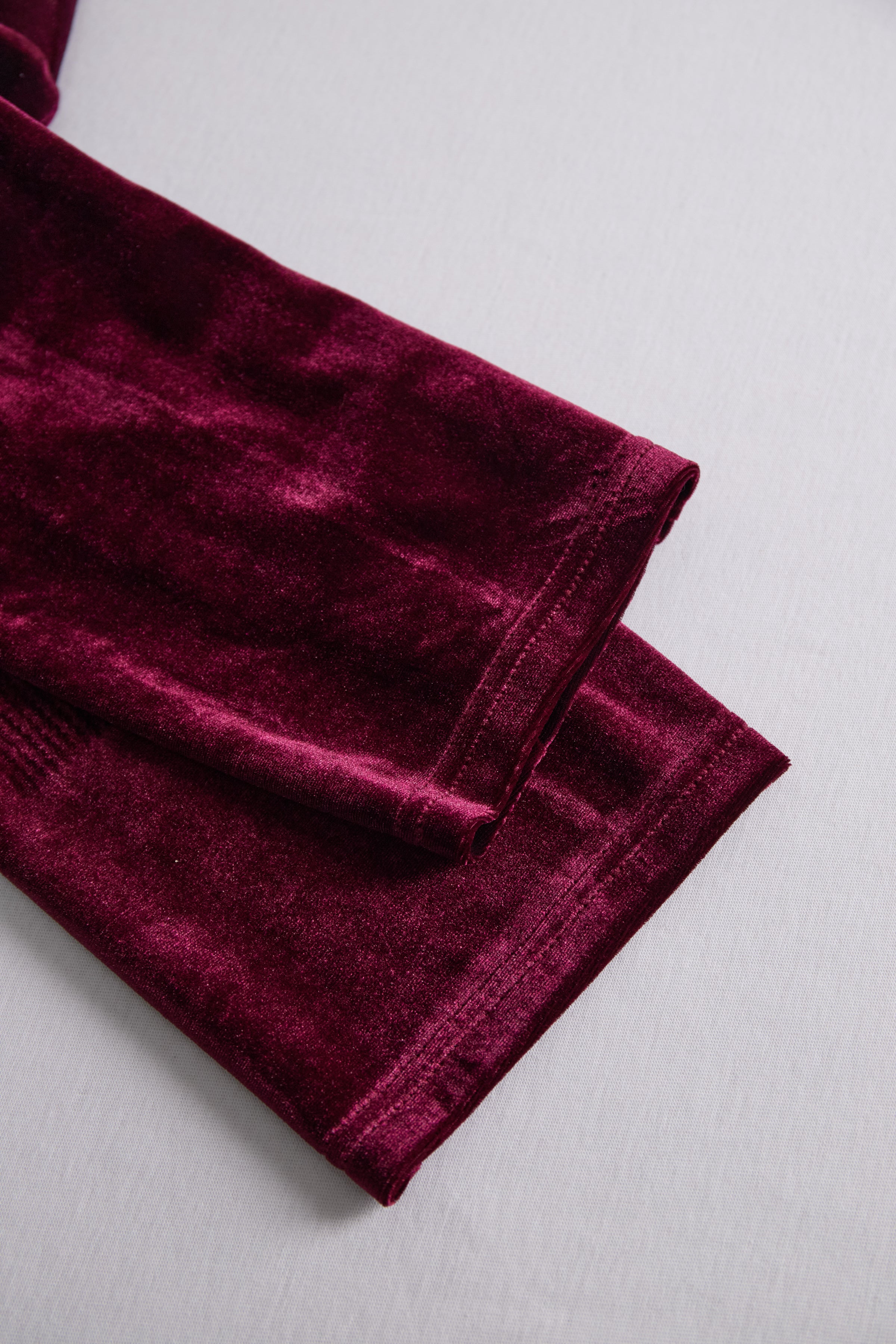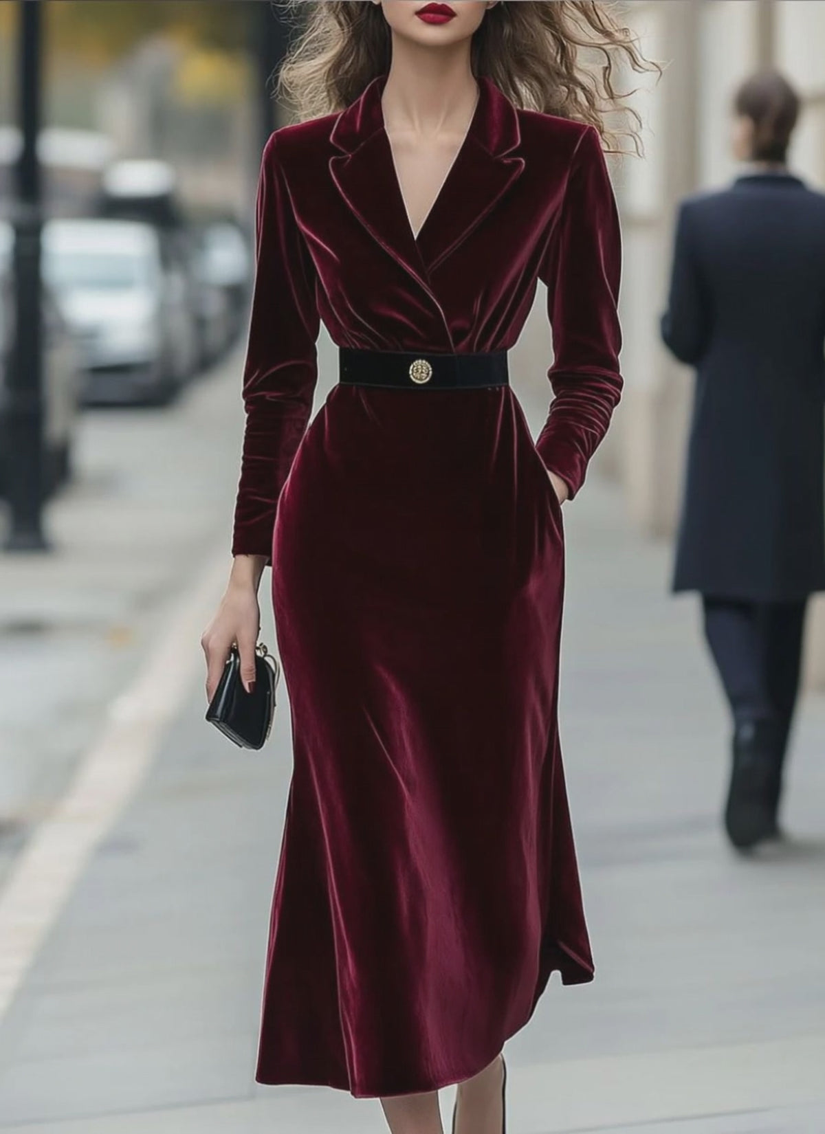 Mooyius presents the Classic Long-Sleeve Velvet Dress with Gold Accents to elevate your sophisticated look. Add a touch of luxury to your wardrobe with this classic burgundy velvet dress, highlighted by its structured lapels and a figure-enhancing silhouette.