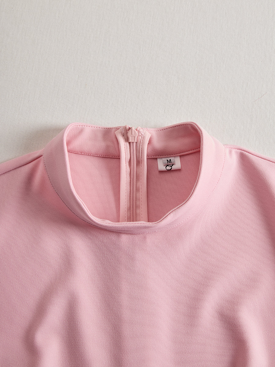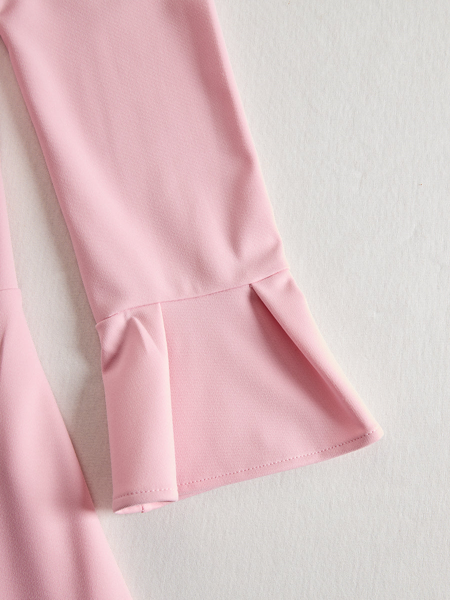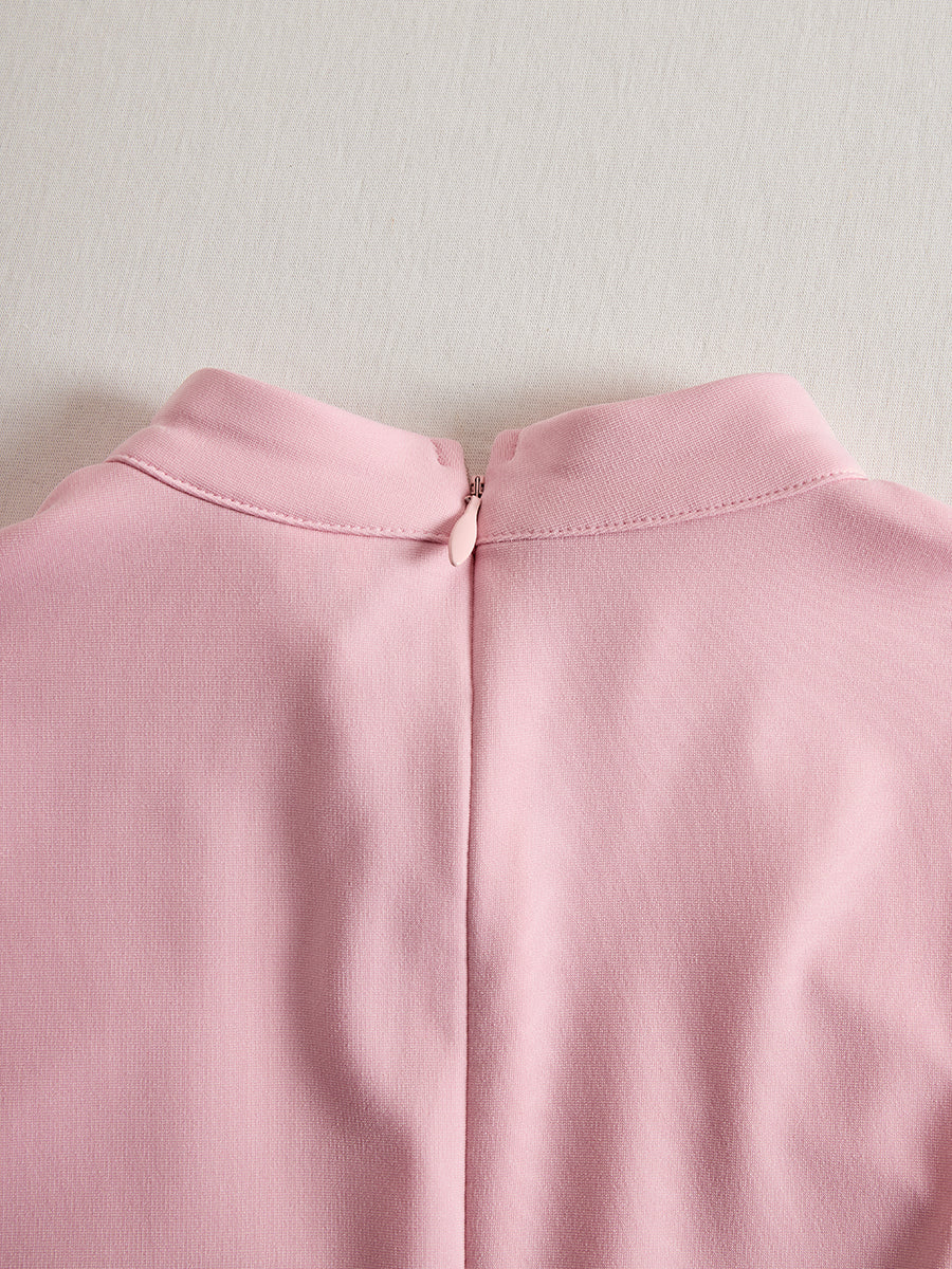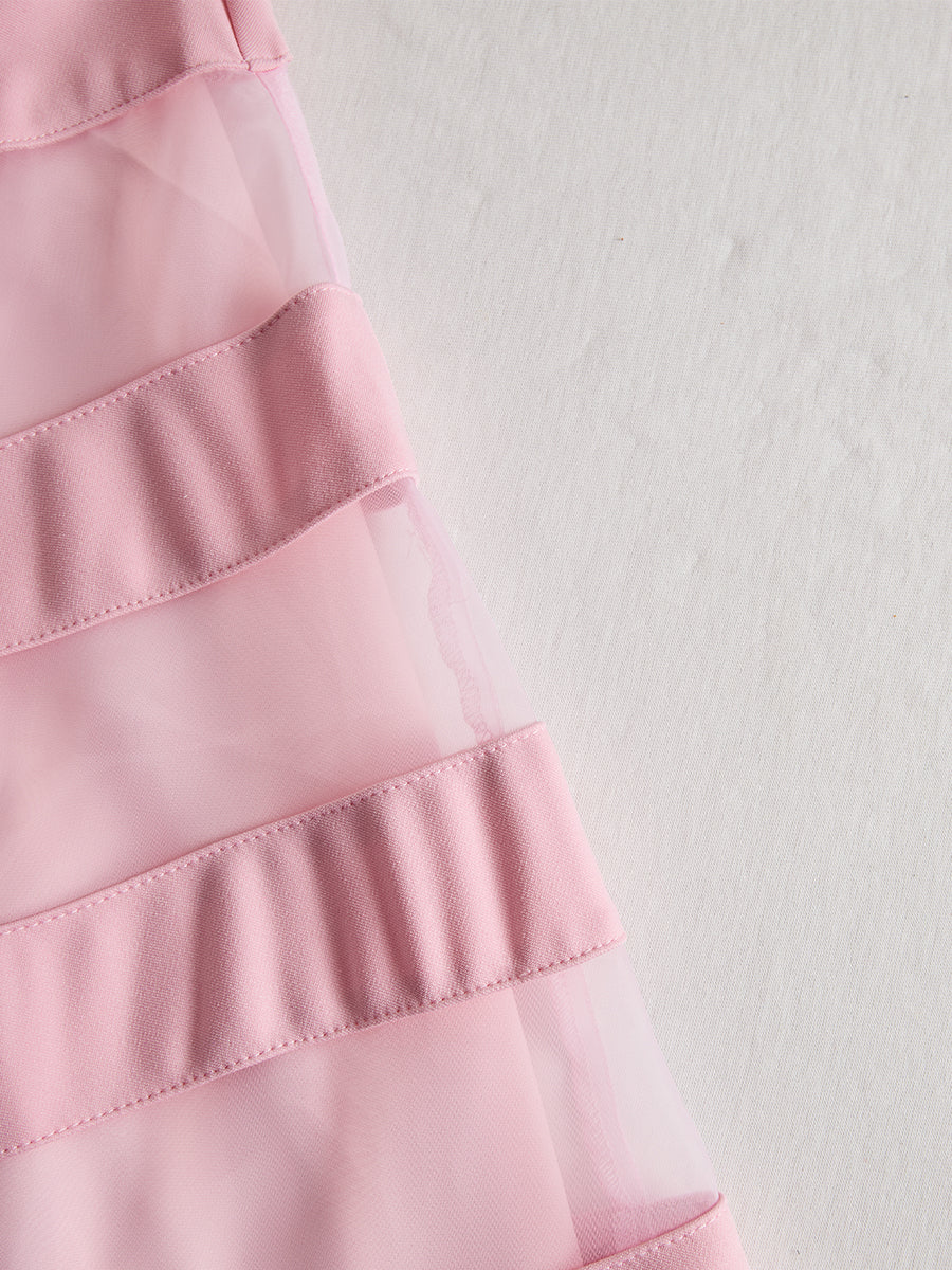 Graceful and refined, this pink flared midi dress captures the essence of feminine sophistication with a modern architectural silhouette. The high neckline and fitted bodice flow seamlessly into a voluminous layered skirt, featuring sheer panel inserts that create soft dimension and movement with every step.