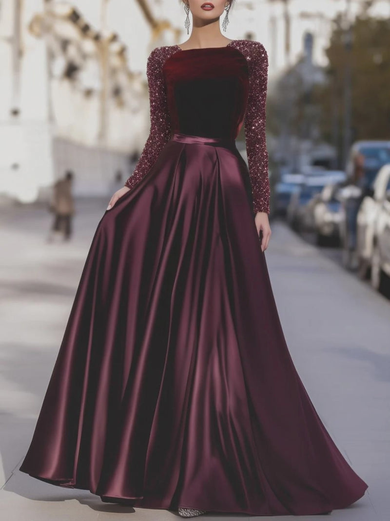Velvet Sequin Sleeve Gown With Satin Skirt