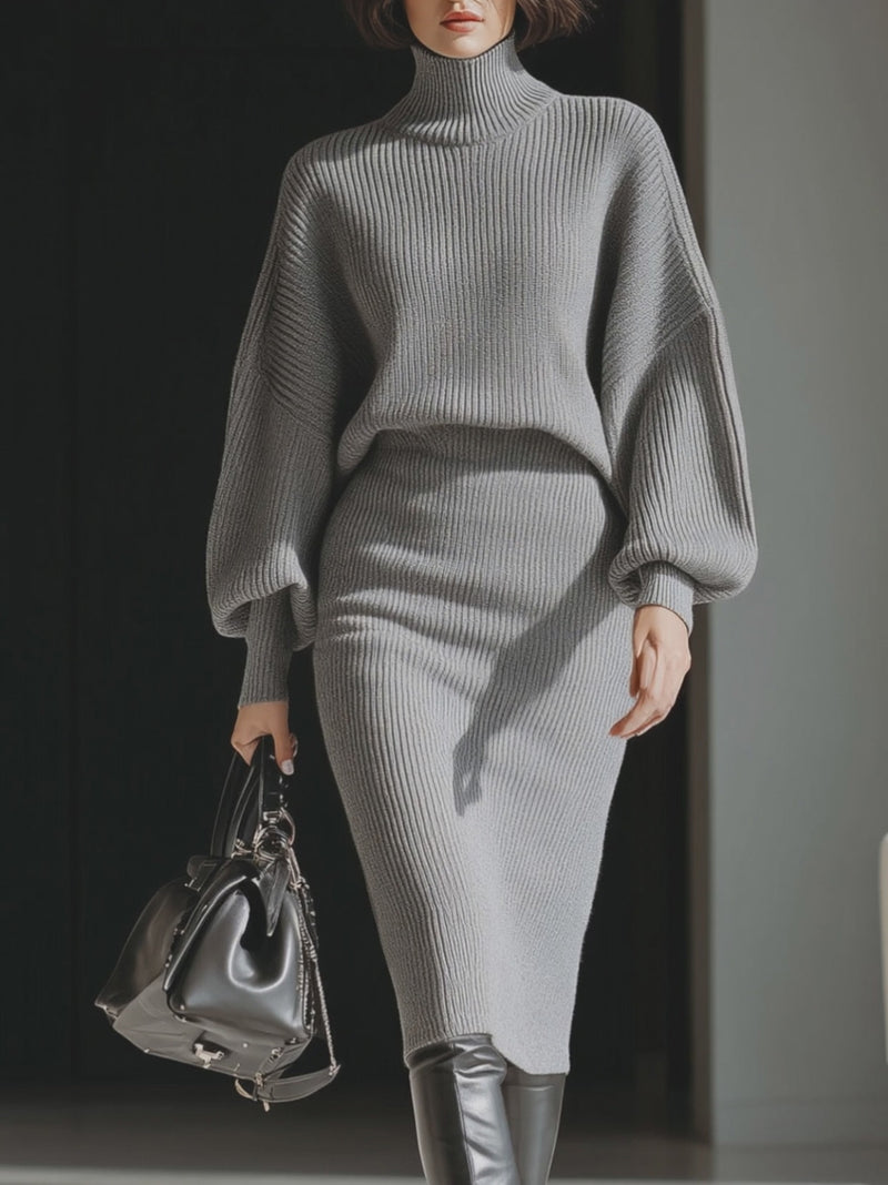 Gray Ribbed Turtleneck Batwing Sweater Dress