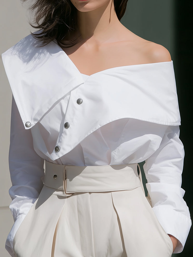 Asymmetric Buttoned Satin Blouse with Cutout Collar Detail