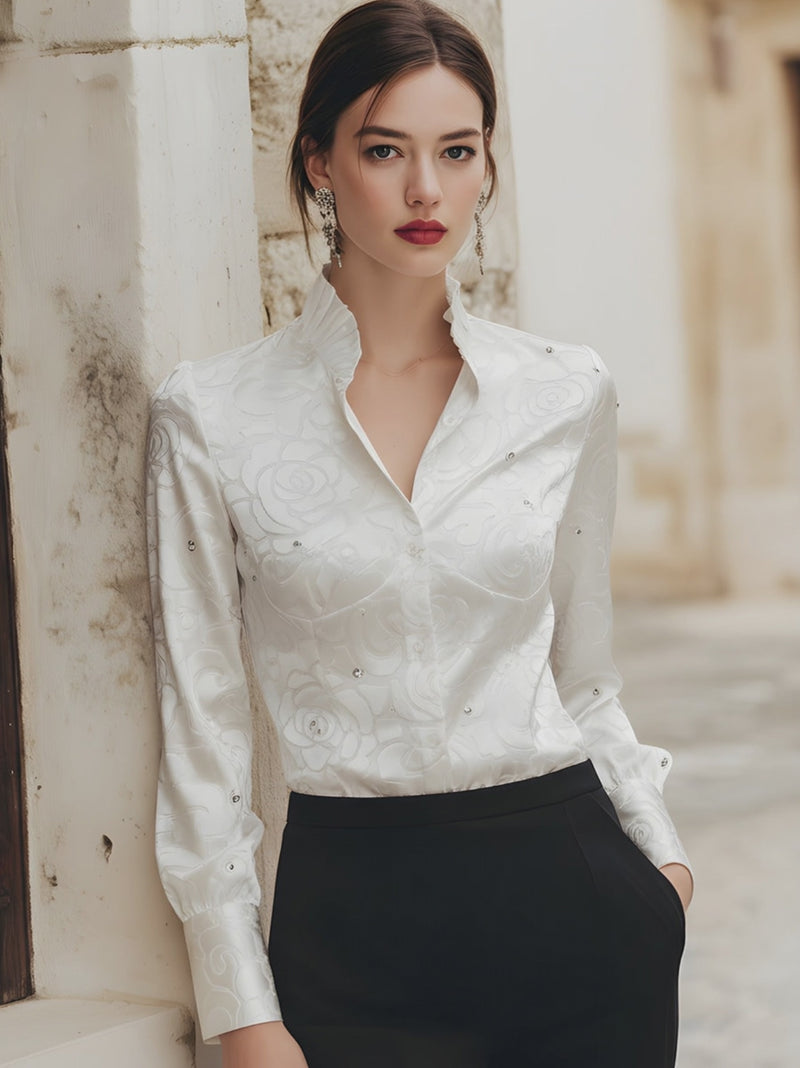 Mooyius Satin Ruffled Collar Button-Down Shirt