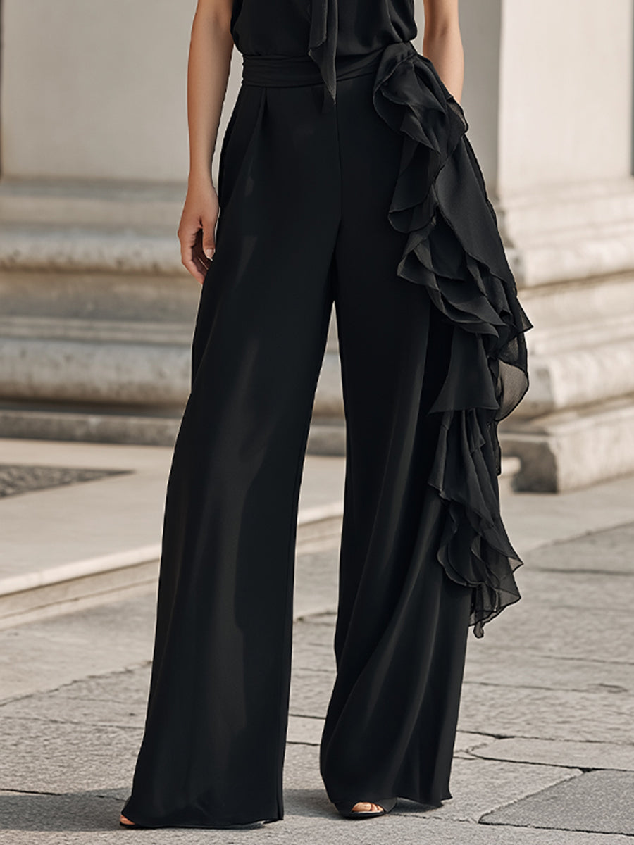 Step into a realm of unparalleled cinematic elegance with this exquisite black chiffon jumpsuit, a masterpiece of fluid motion and avant-garde tailoring. This ensemble is designed for the modern woman who seeks to balance a powerful, architectural silhouette with a soft, romantic allure.