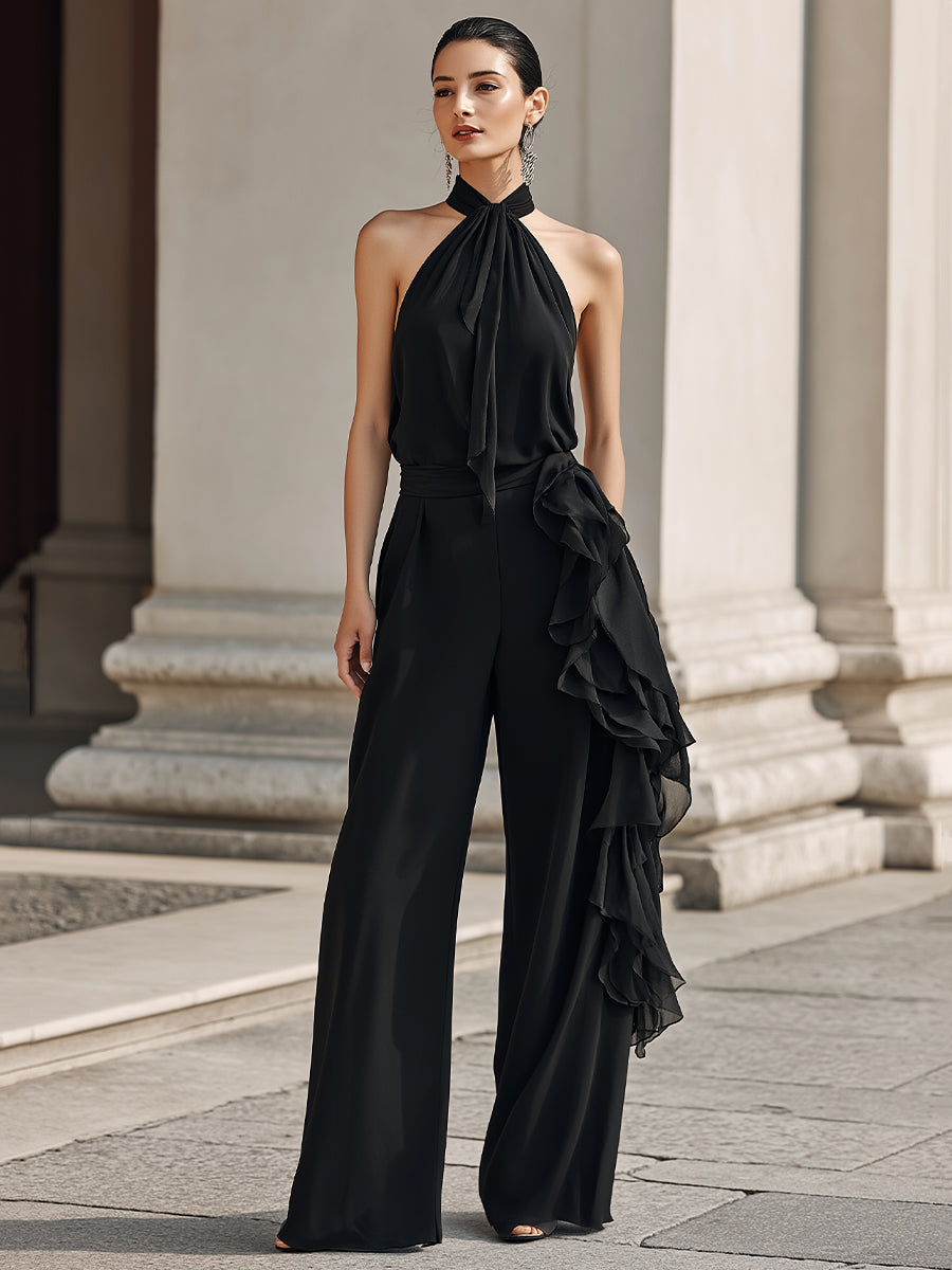 Midnight Chiffon Halter Jumpsuit With Dramatic Side Cascades
