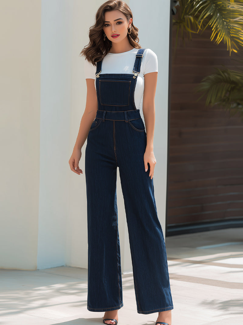 Dark Blue Denim Wide-Leg Overalls Jumpsuit