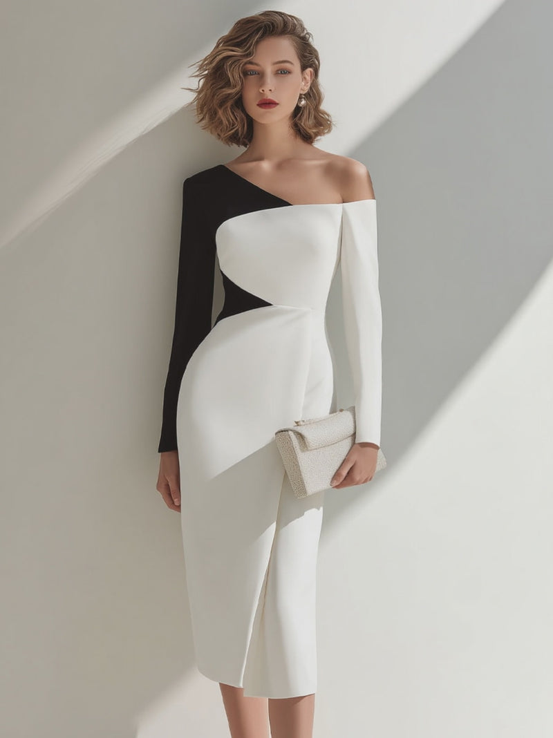 This black and white asymmetrical midi dress embodies sophisticated minimalism with its bold color contrast and sharp lines. The one-shoulder design adds an element of surprise, while the body-skimming fit creates a flattering, elongated silhouette. A standout piece for any evening affair, this dress combines modern flair with timeless elegance.