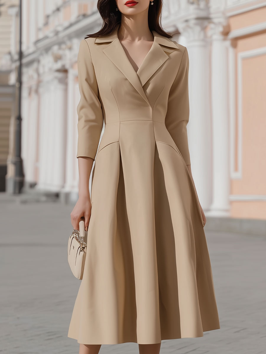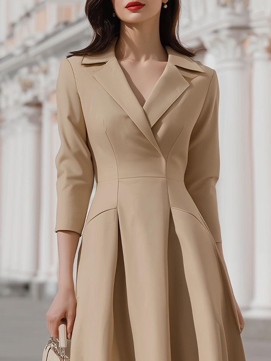 Mooyius presents the beige blazer-style midi dress. Featuring a structured blazer collar, deep V-neckline, tailored three-quarter sleeves, and a cinched waist leading to a flowing A-line skirt, this dress merges sharp office-chic tailoring with elegant feminine movement—effortlessly balancing professionalism and grace. The smooth matte fabric enhances its polished silhouette, making it the perfect choice for business meetings, formal lunches, or semi-formal daytime events.