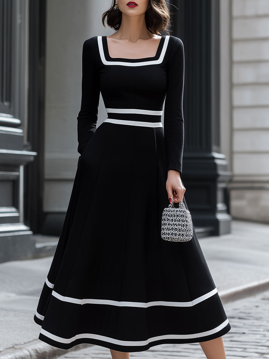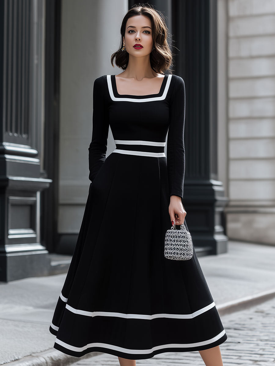 Mooyius Retro Black & White Contrast Square Neck Midi Dress