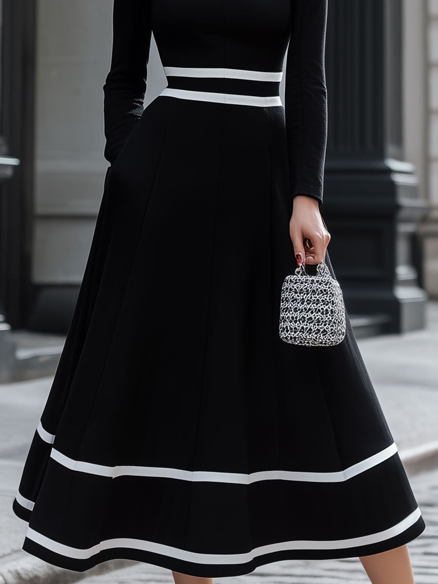 - Fit:Square neckline (white trim), long fitted sleeves, waist stripe detail, A-line midi skirt (double white hem bands)