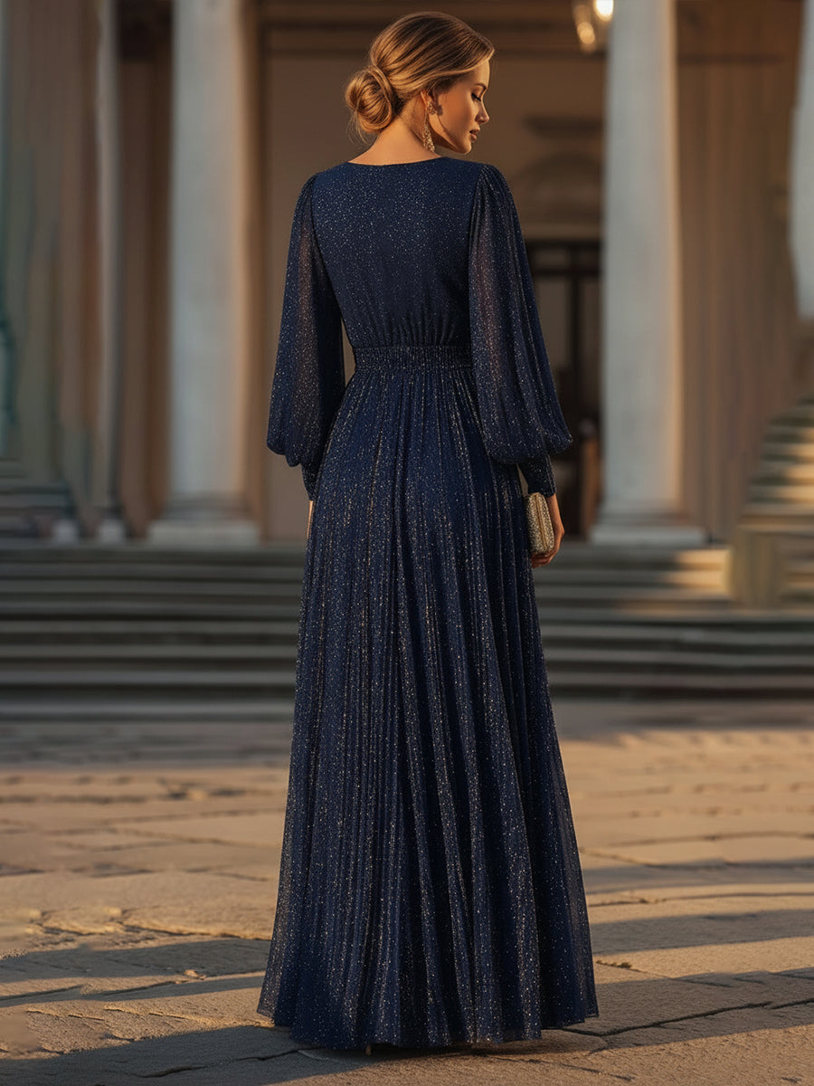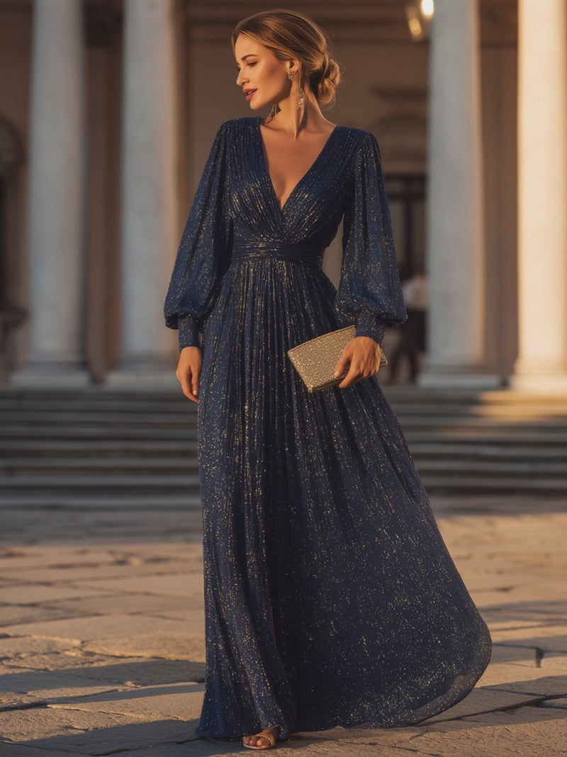 Mooyius presents a luminous evening gown designed to captivate with its flowing silhouette and refined glamour. The deep V-neckline creates an elongated, elegant frame, while the pleated bodice cinches gently at the waist to enhance natural curves. Full, billowing sleeves add soft drama, balanced by fitted cuffs for a polished finish. The skirt cascades into a floor-length drape with fluid movement, enriched by delicate shimmer woven throughout, giving the gown a radiant, ethereal glow under evening light.