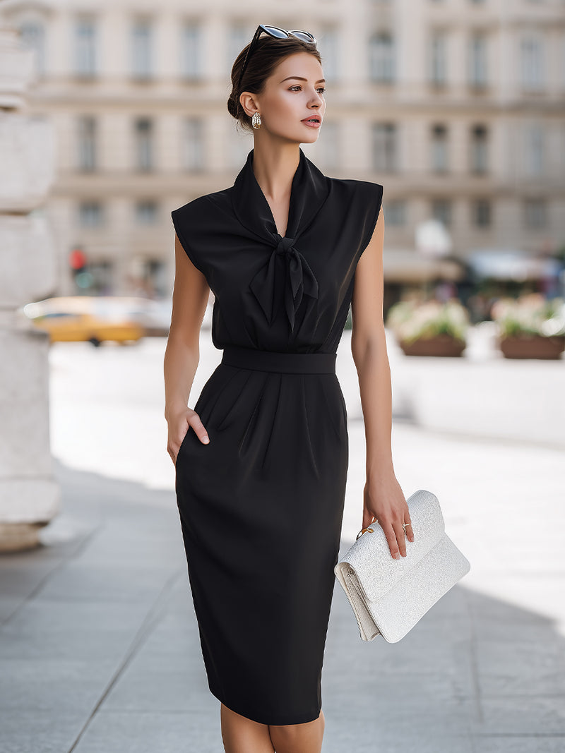 Sleeveless Tie-Neck Draped Pencil Dress With Defined Waist