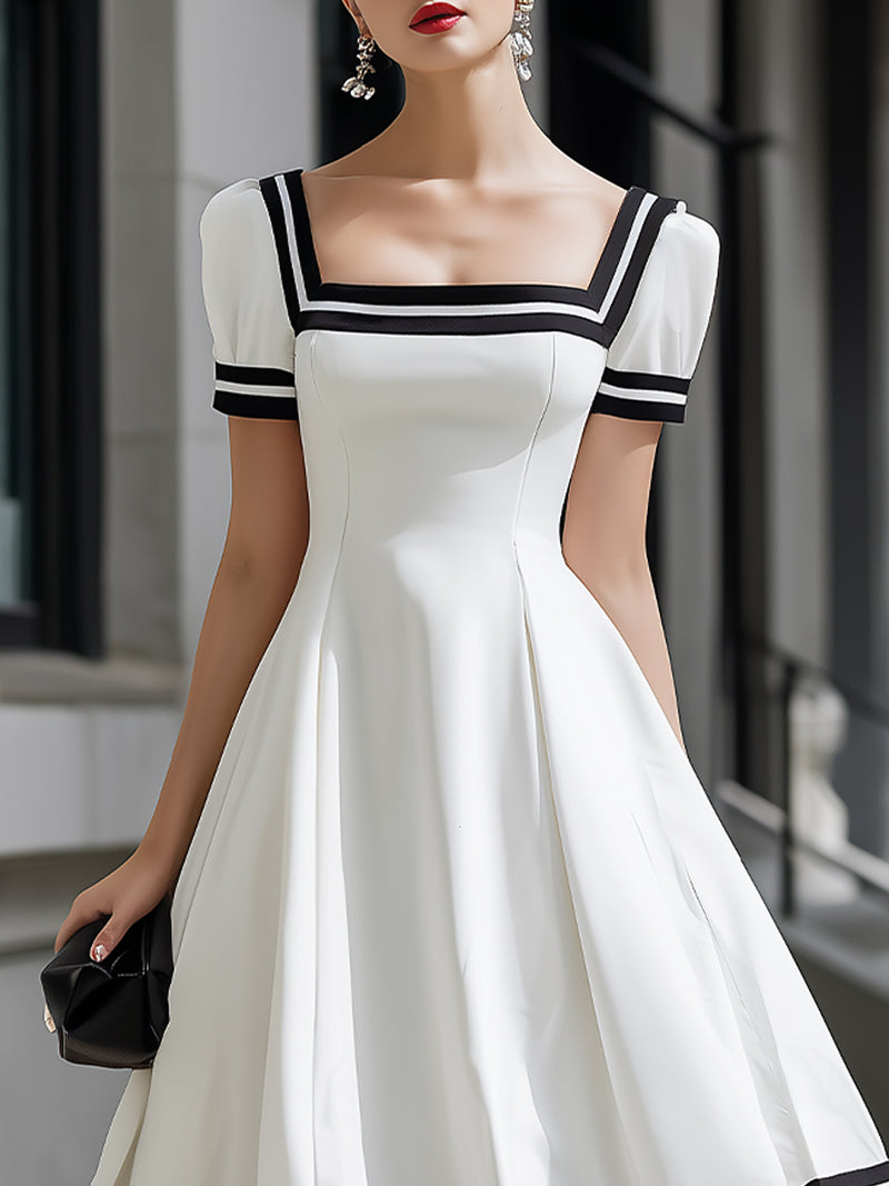 Black & White Asymmetric Color-Block Mandarin Collar Midi Sheath Dress