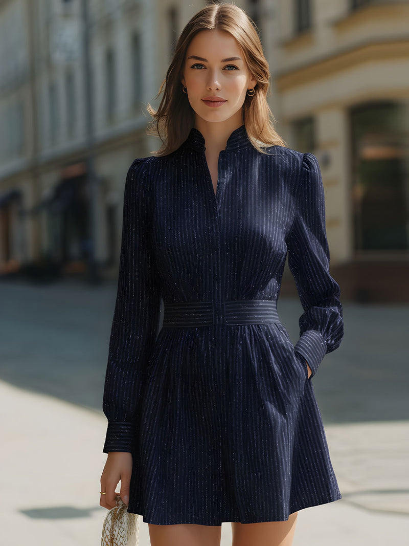 Navy Pinstripe Long-Sleeve Mini Dress With Structured Waist