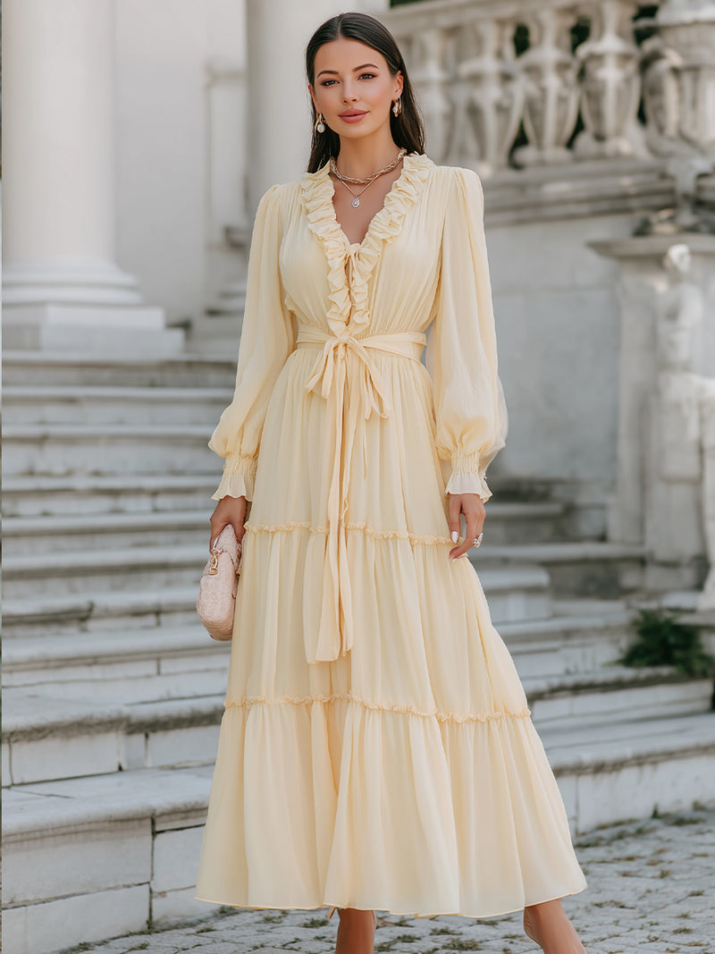 Ruffle-Trim Tiered Chiffon Midi Dress